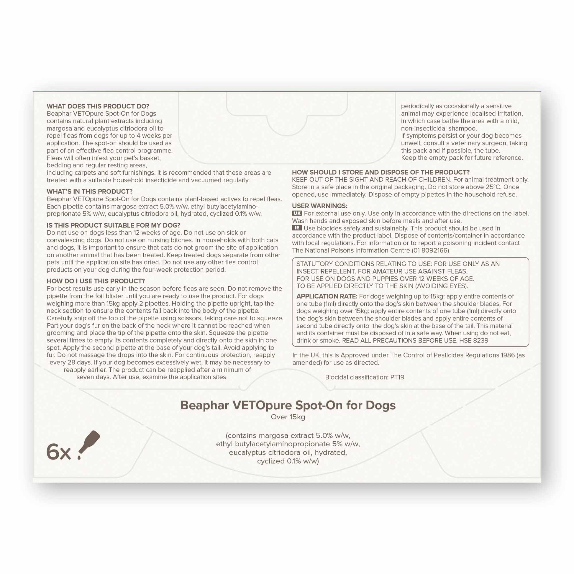 Beaphar VETOpure Flea Spot-On for Dogs over 15kg contains natural plant extracts including margosa and eucalyptus citriodora oil to repel fleas from dogs for up to 4 weeks per application.