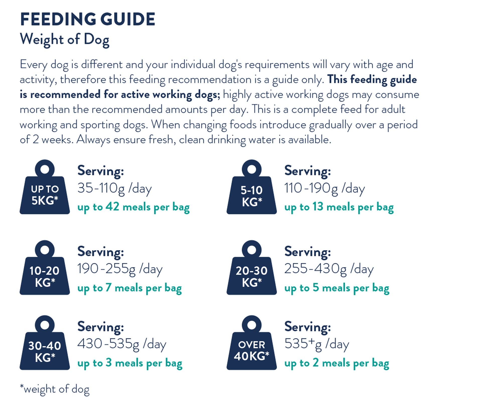 Every dog is unique and feeding amounts will vary with age, activity and metabolism. Please use this chart as an initial guide and adjust amounts accordingly. Feed twice daily and always provide fresh, clean water.