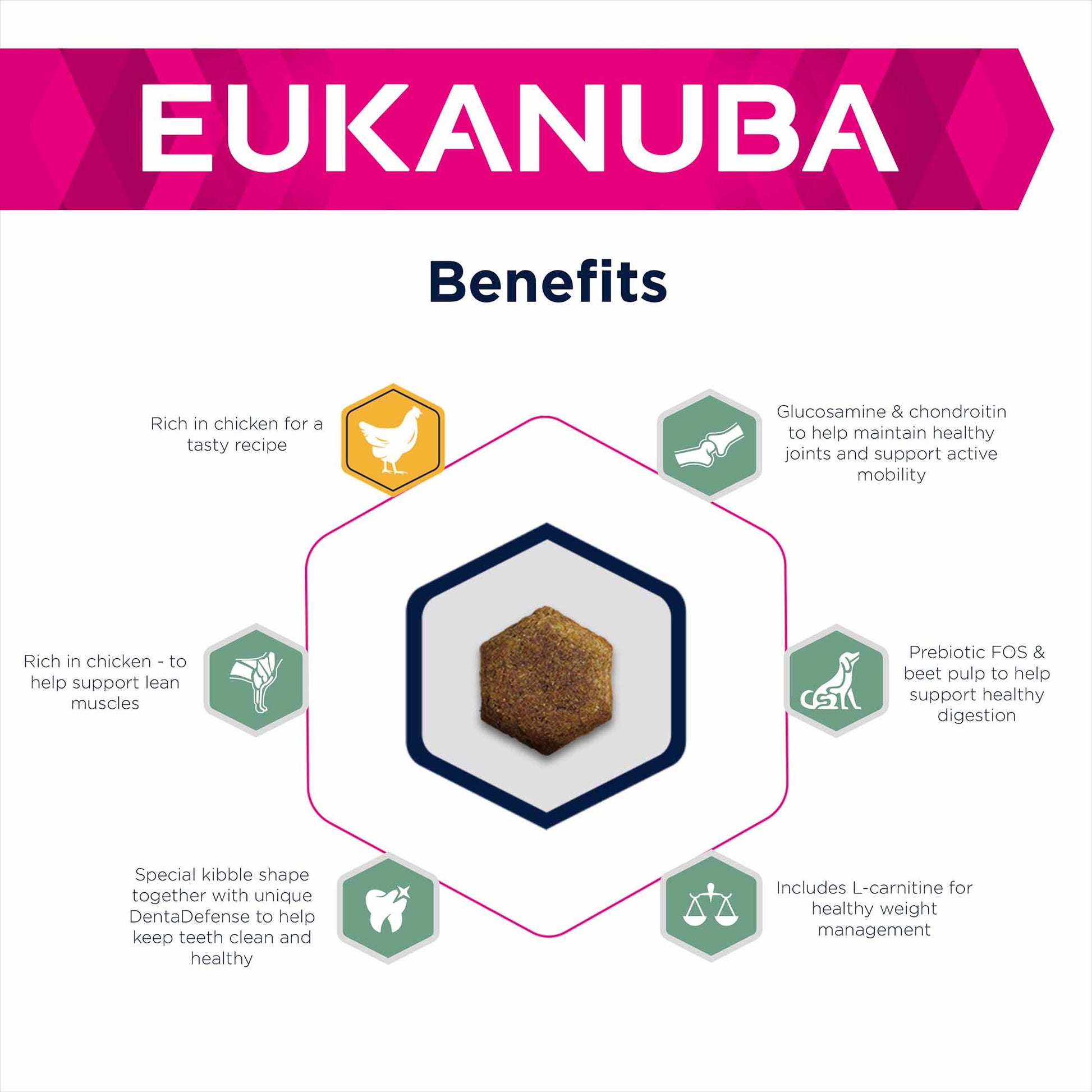 Eukanuba Daily Care Adult 1+ Years Sensitive Joints Dog Food is for dogs who suffer from joint complaints. The added glucosamine and chondroitin help to maintain healthy joints and support active mobility. Additionally, L-carnitine is included to support a healthy weight management and to lessen the strain on joints. The special hexagonal kibble shape together with the unique DentaDefense helps to keep teeth clean and healthy. This food is 100% complete and balanced and is ideal for adult dogs of all breeds.