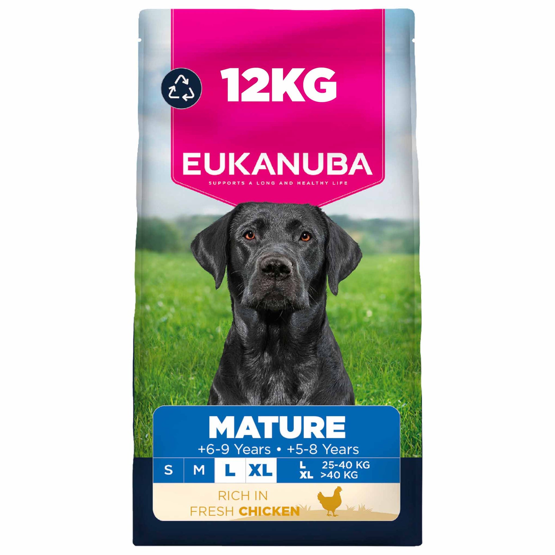 Specifically designed for large-sized mature dogs aged 6 to 9 years (or 5 - 8 years for giant breeds), this EUKANUBA dry dog food is formulated with fresh chicken and offers 100% complete and balanced nutrition. Carefully selected ingredients provide tailored support for healthy aging, ensuring your dog stays active and vibrant. The inclusion of L-Carnitine helps burn fat, promoting an optimal weight and easing strain on the joints, allowing your mature dog to support mobility and comfort. Trust EUKANUBA to deliver advanced nutrition for your dog's golden years.