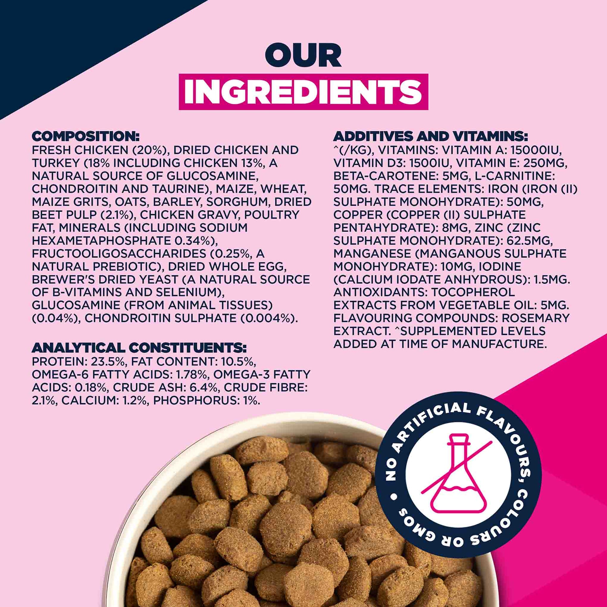 fresh chicken (20%), dried chicken and turkey (18% including chicken 13%, a natural source of glucosamine, chondroitin and taurine), maize, wheat, maize grits, oats, barley, sorghum, dried beet pulp (2.1%), chicken gravy, poultry fat, minerals (including sodium hexametaphosphate 0.34%), fructooligosaccharides (0.25%, a natural prebiotic), dried whole egg, brewer's dried yeast (a natural source of B-vitamins and selenium), glucosamine (from animal tissues) (0.04%), chondroitin sulphate (0.004%).