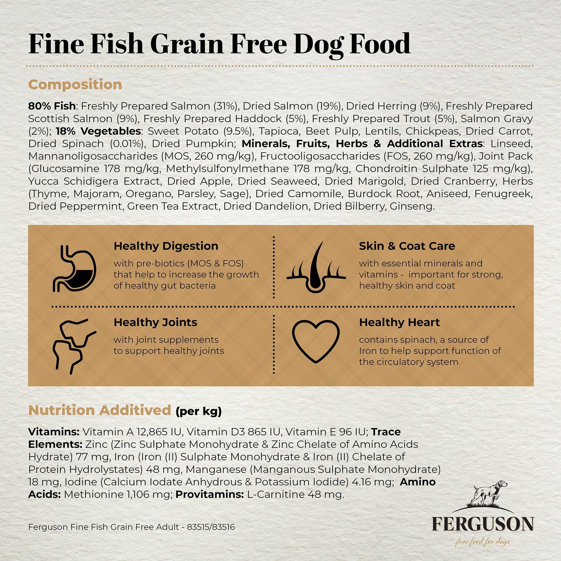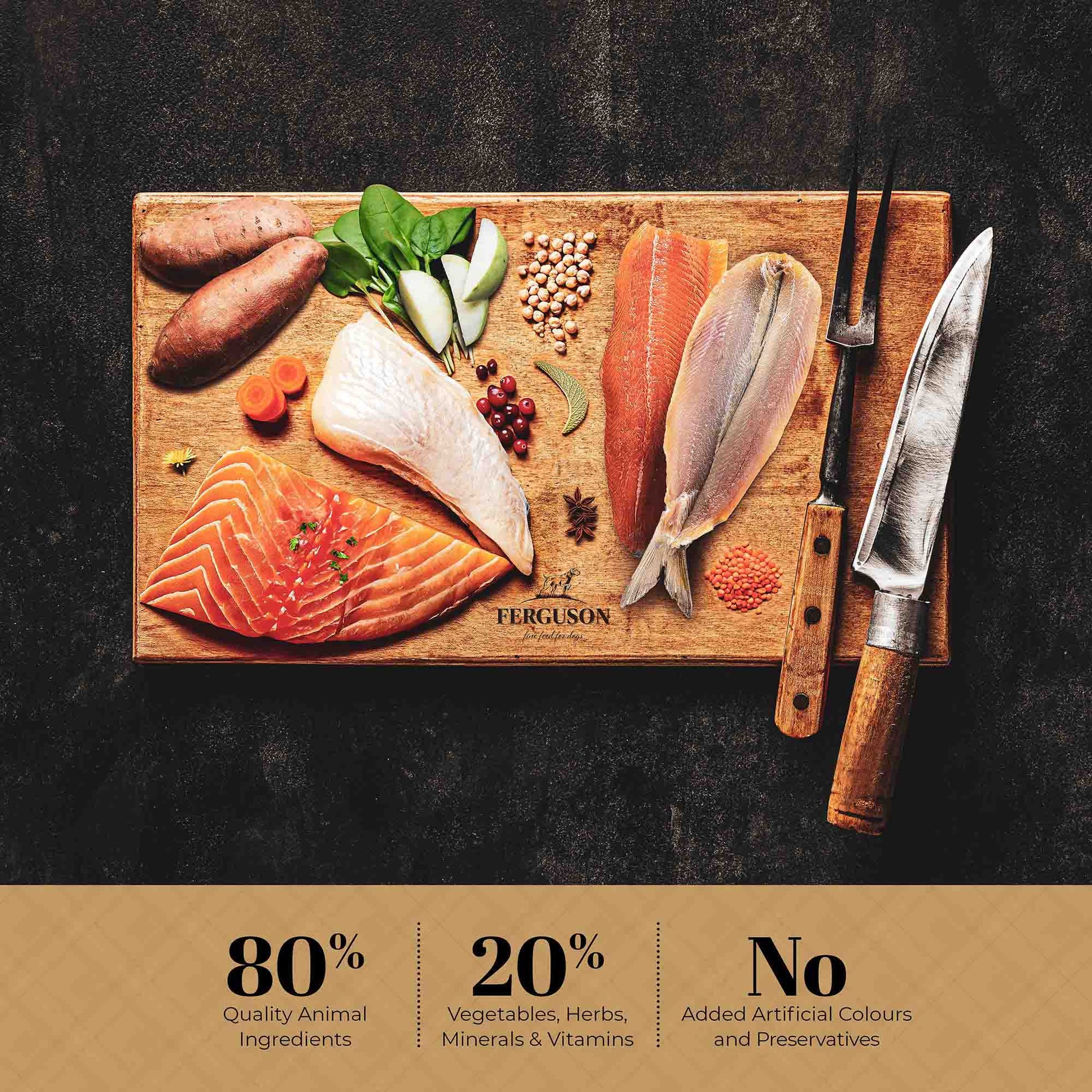 You can feel good about feeding your dog Ferguson Fine Fish 80/20 Grain Free Dry Dog Food, because it's made with the same thought and care that you would put into your own food.