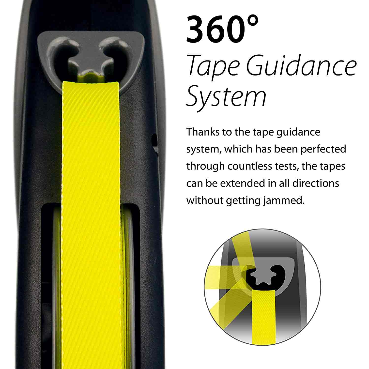The retractable tape is 8 meters long, and has a bright neon yellow colour to increase the visibility of you, and your pet, when you are out in low light conditions.