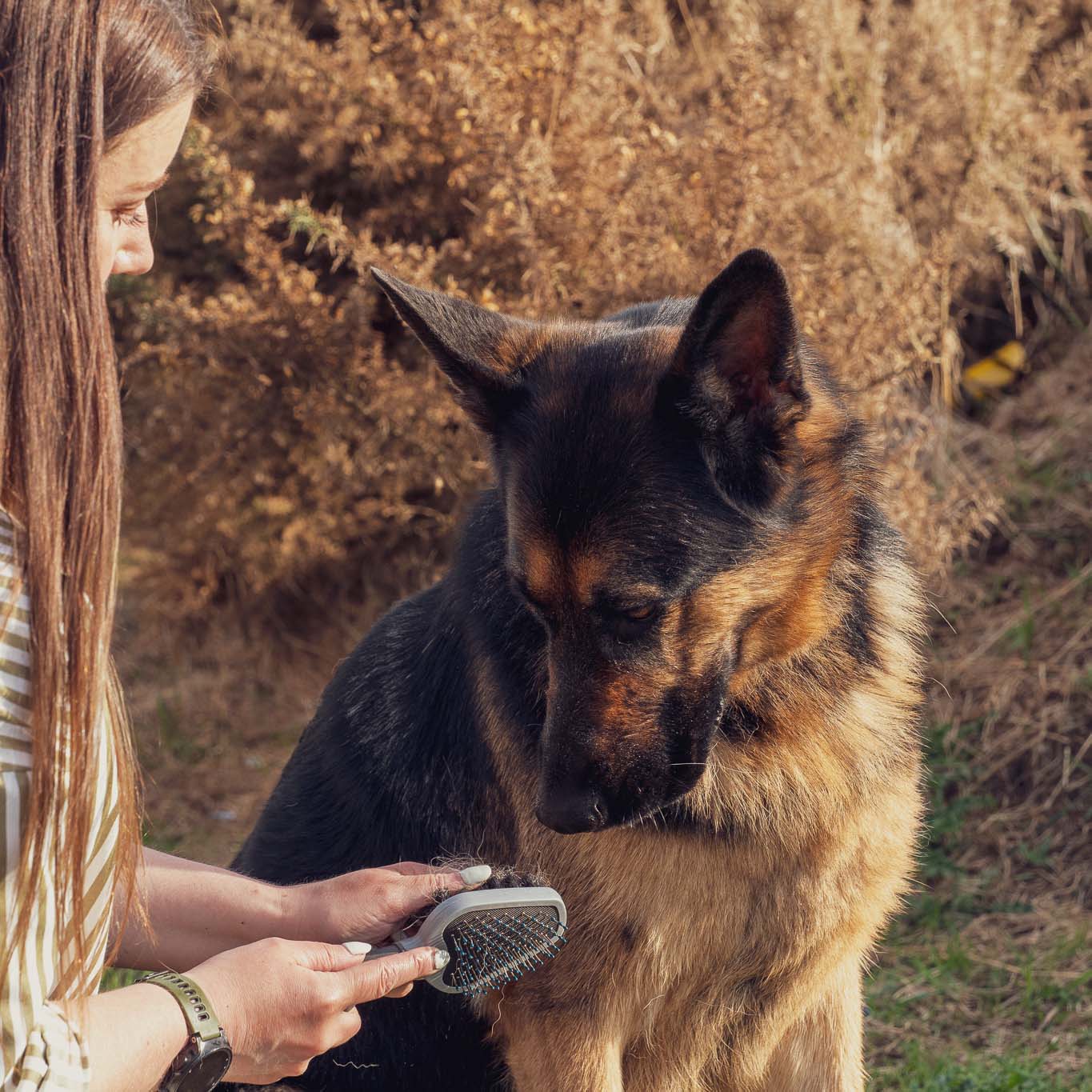 The brush head features a metal bristle side and a Boar’s hair bristle side. The brush follows the natural contours of your pet's head and body giving a better natural finish and shine to their coat.