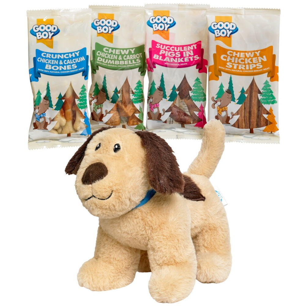 Good Boy Real Meat Gift Tin is a stylish gifting tin is packed with yummy high meat Chicken Strips, Pigs in Blankets, Chicken and Carrot Dumbbells and Chicken and Calcium Bones. Also includes a toy.