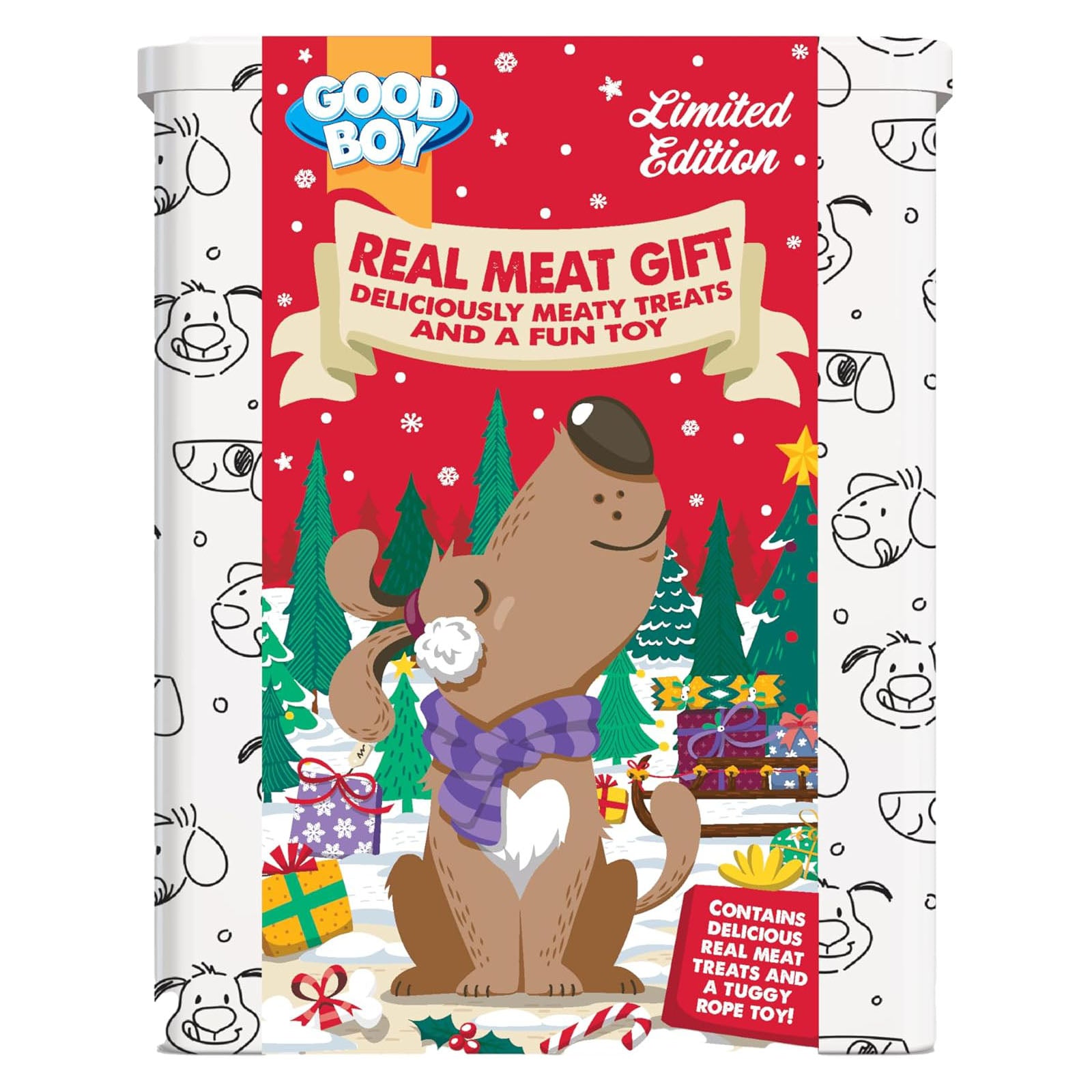 Good Boy Real Meat Gift Tin is a stylish gifting tin is packed with yummy high meat Chicken Strips, Pigs in Blankets, Chicken and Carrot Dumbbells and Chicken and Calcium Bones. Also includes a tug rope dog toy.
