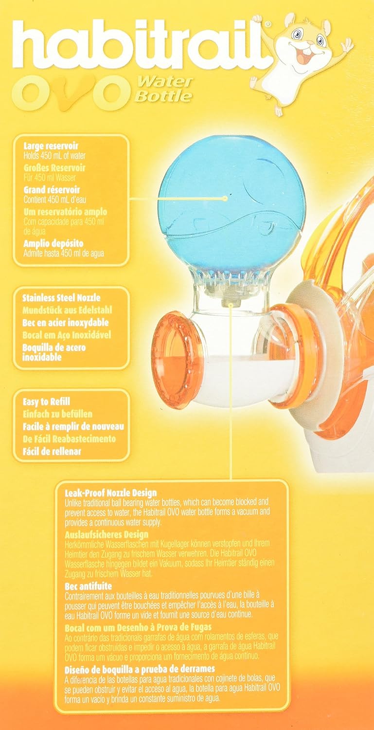 Habitrail OVO Water Bottle is an easy-to-access and easy-to-maintain add-on that features a large, overhead 450ml water reservoir and a leak-proof, stainless steel nozzle that provides hamsters with a continuous water supply with no ball for the hamster to push in order to access it.