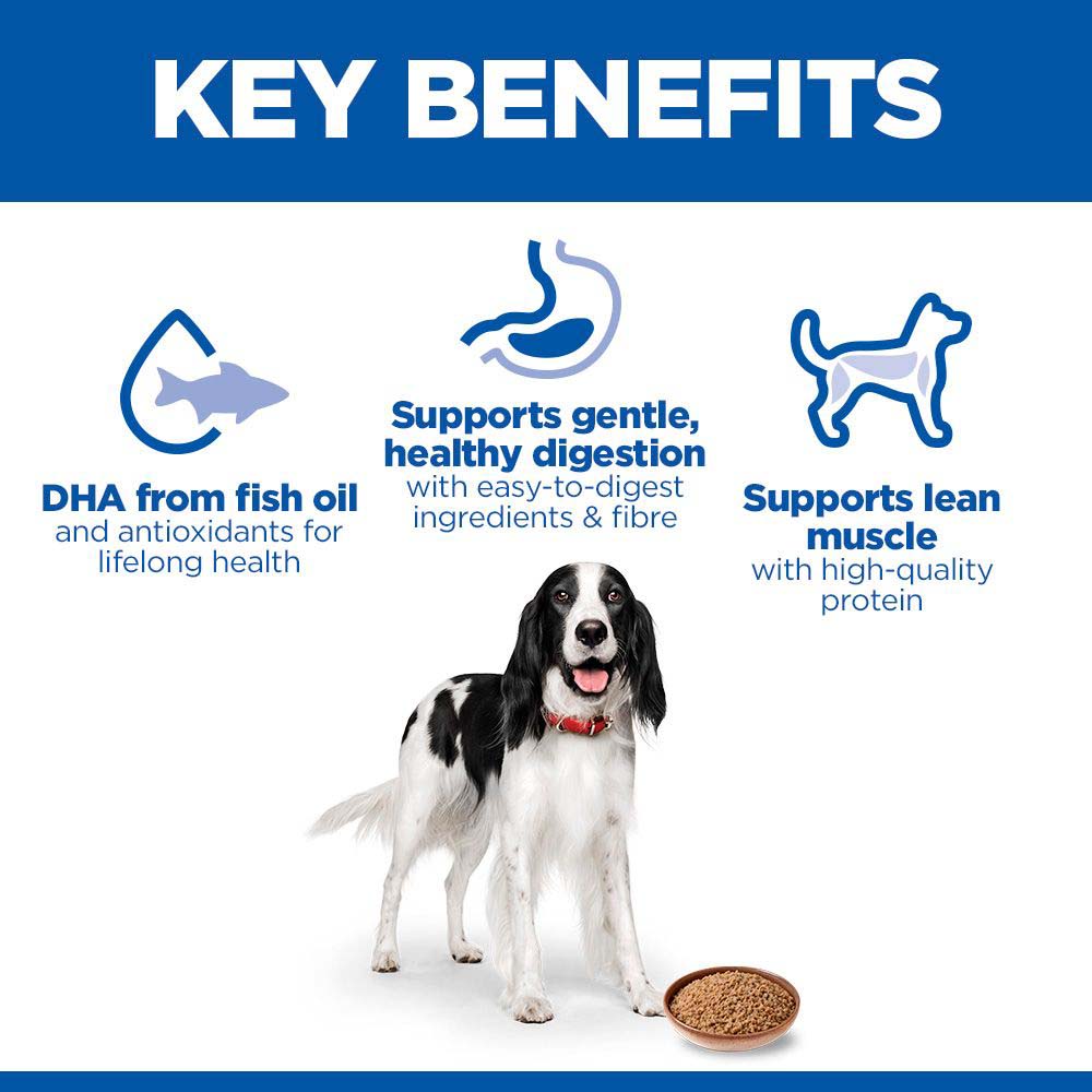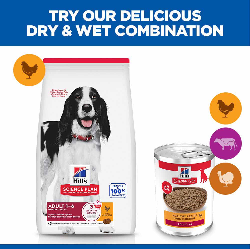 Your dog will love the taste of Hills Science Plan Adult Wet Dog Food with Chicken, with its soft, smooth texture. It has the perfect balance of taste and nutrition for your dog. Precisely balanced to deliver the appropriate amount of energy to support ideal body weight in adult dogs aged 1 – 6 years.