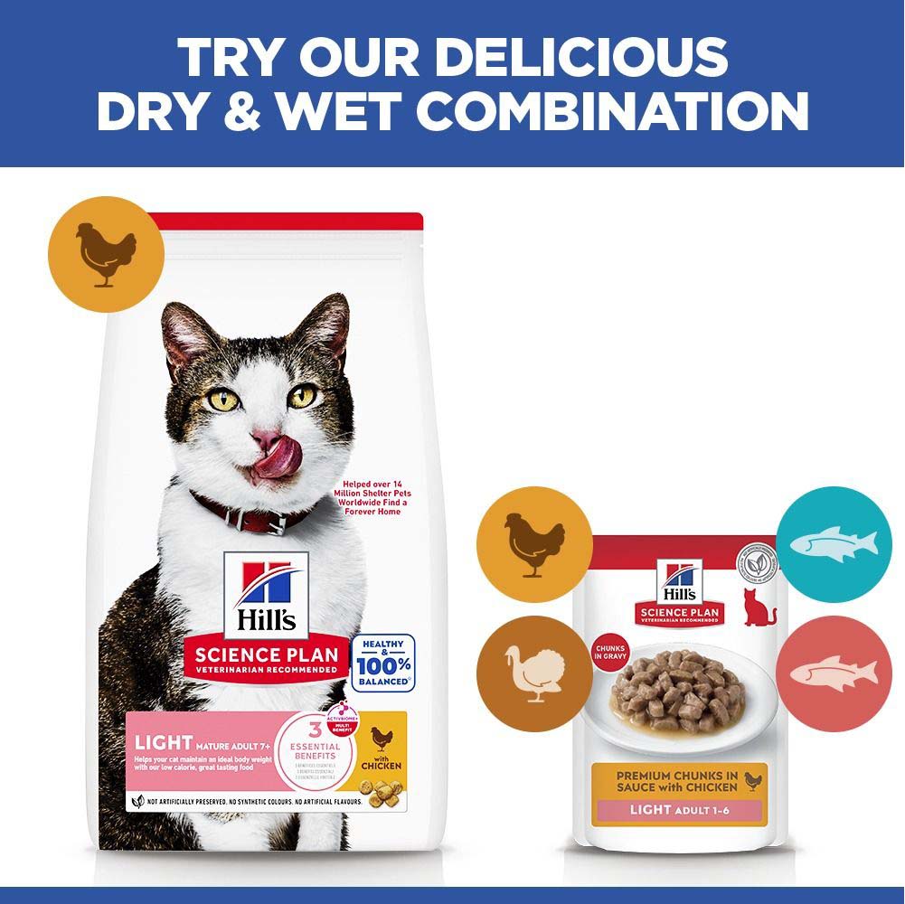 Hills Science Plan Mature Light Dry Cat Food is precise nutrition for less active adult cats requiring a low calorie food to maintain a healthy weight & lifestyle. Low calories & L-Carnitine help promote ideal body weight. High-quality protein & natural fibers help satisfy hunger between meals. Omega-6s & Vitamin E for beautiful skin & fur.