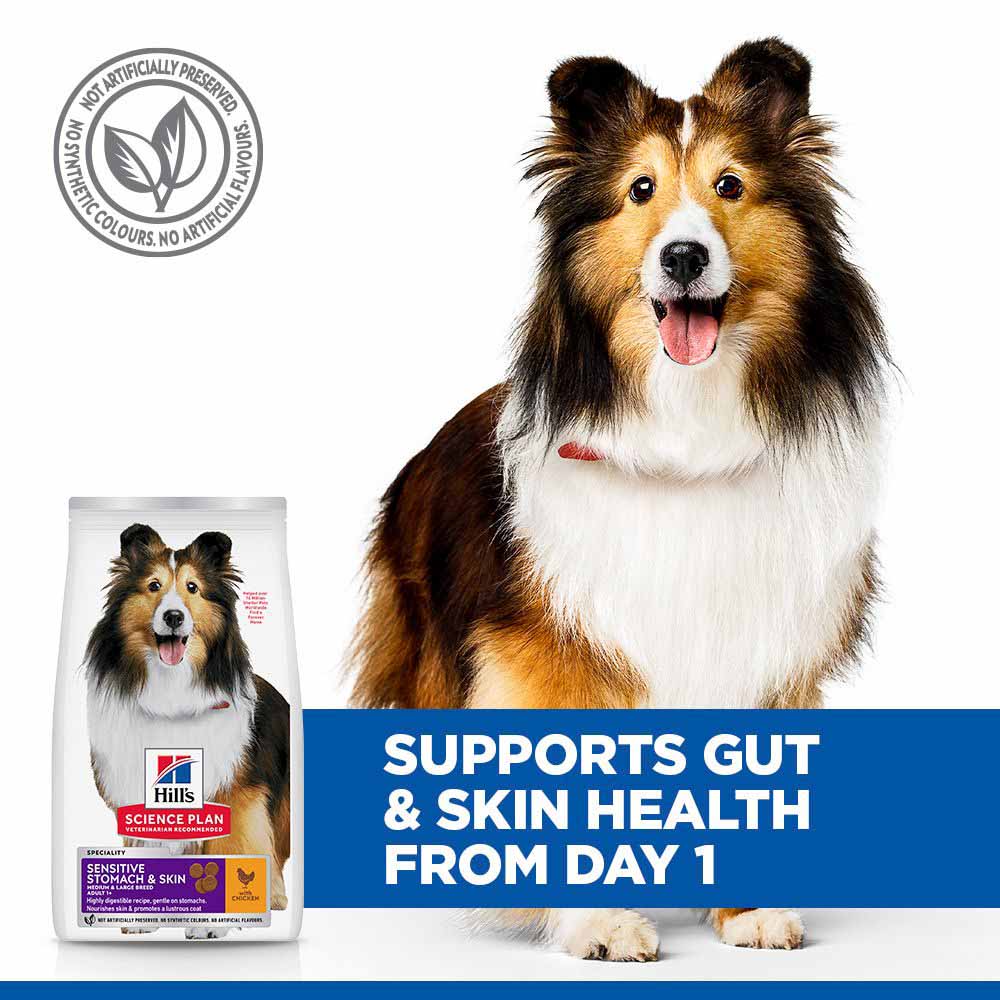 Hills Science Plan Sensitive Stomach & Skin Medium Breed Adult Dry Dog Food supports digestive health with prebiotic fibre.
