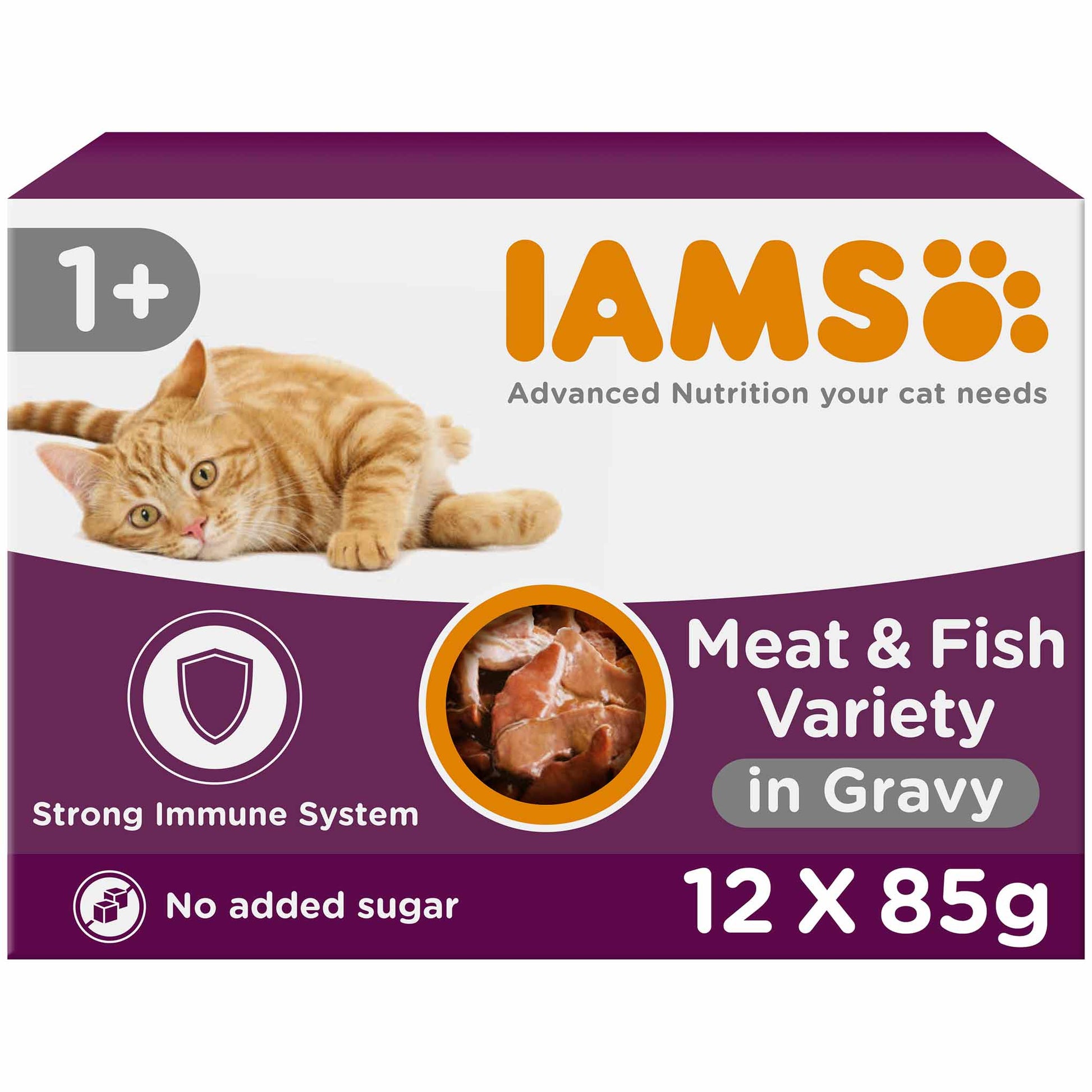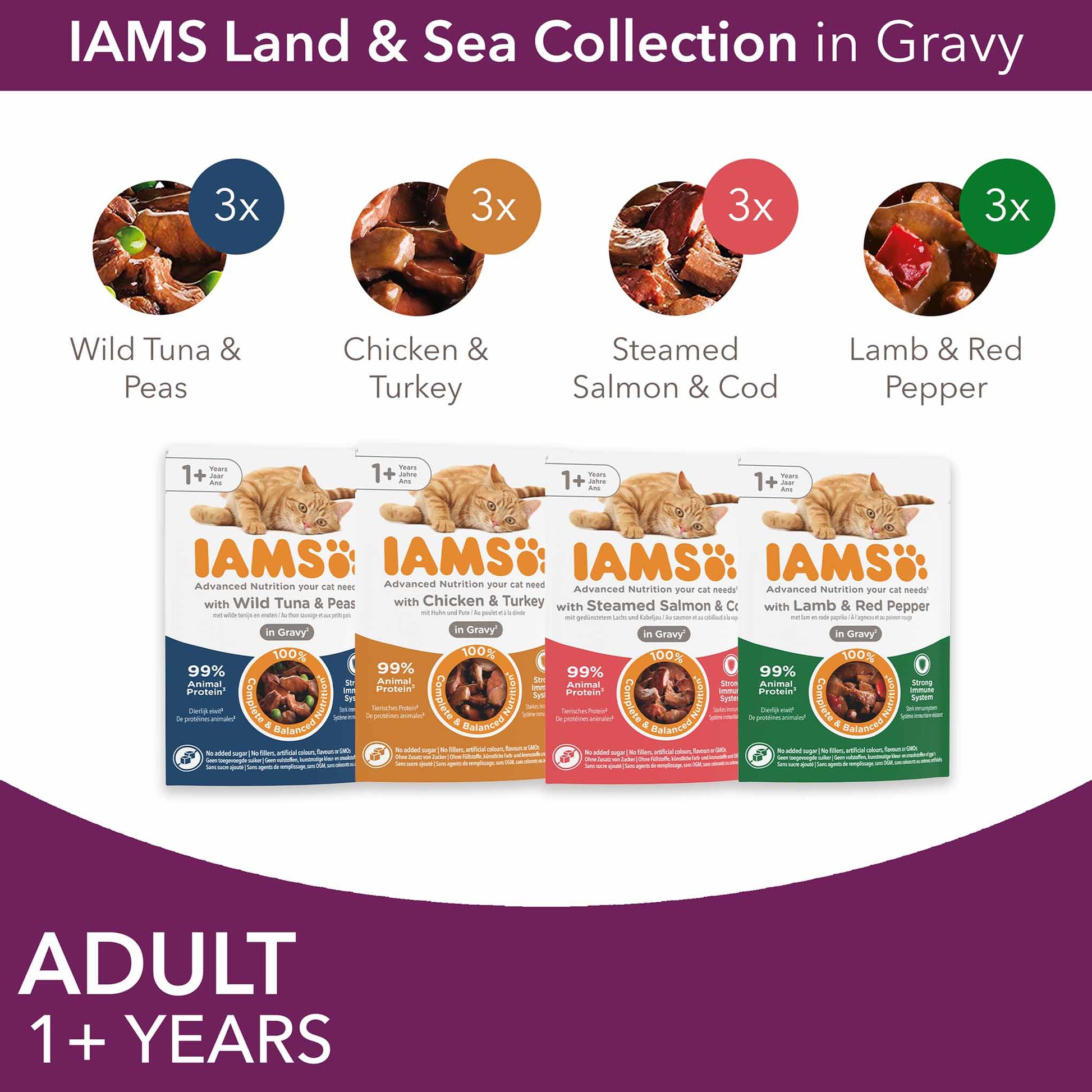 IAMS Advanced Nutrition cat wet food pouches land and sea collection in gravy with 99% animal protein*, formulated for cats 1+ years old, support a strong immune system by providing the nourishment your cat naturally needs. Plus, the 100% complete and balanced nutrition pouches in the flavours with chicken & turkey, with lamb & red pepper, with wild tuna & peas and with steamed salmon & cod are made with no added sugar and no fillers, artificial colours, flavours, or GMOs, ensuring a wholesome and nutritious meal for your feline companion.