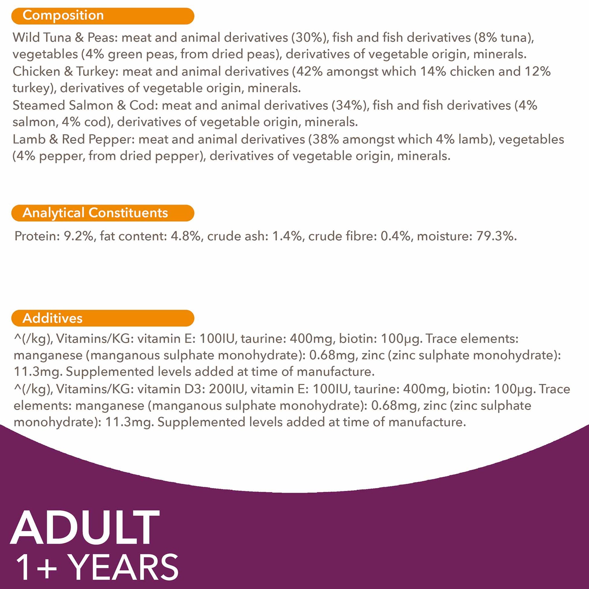 protein: 9.2%, fat content: 4.8%, crude ash: 1.4%, crude fibre: 0.4%, moisture: 79.3%.