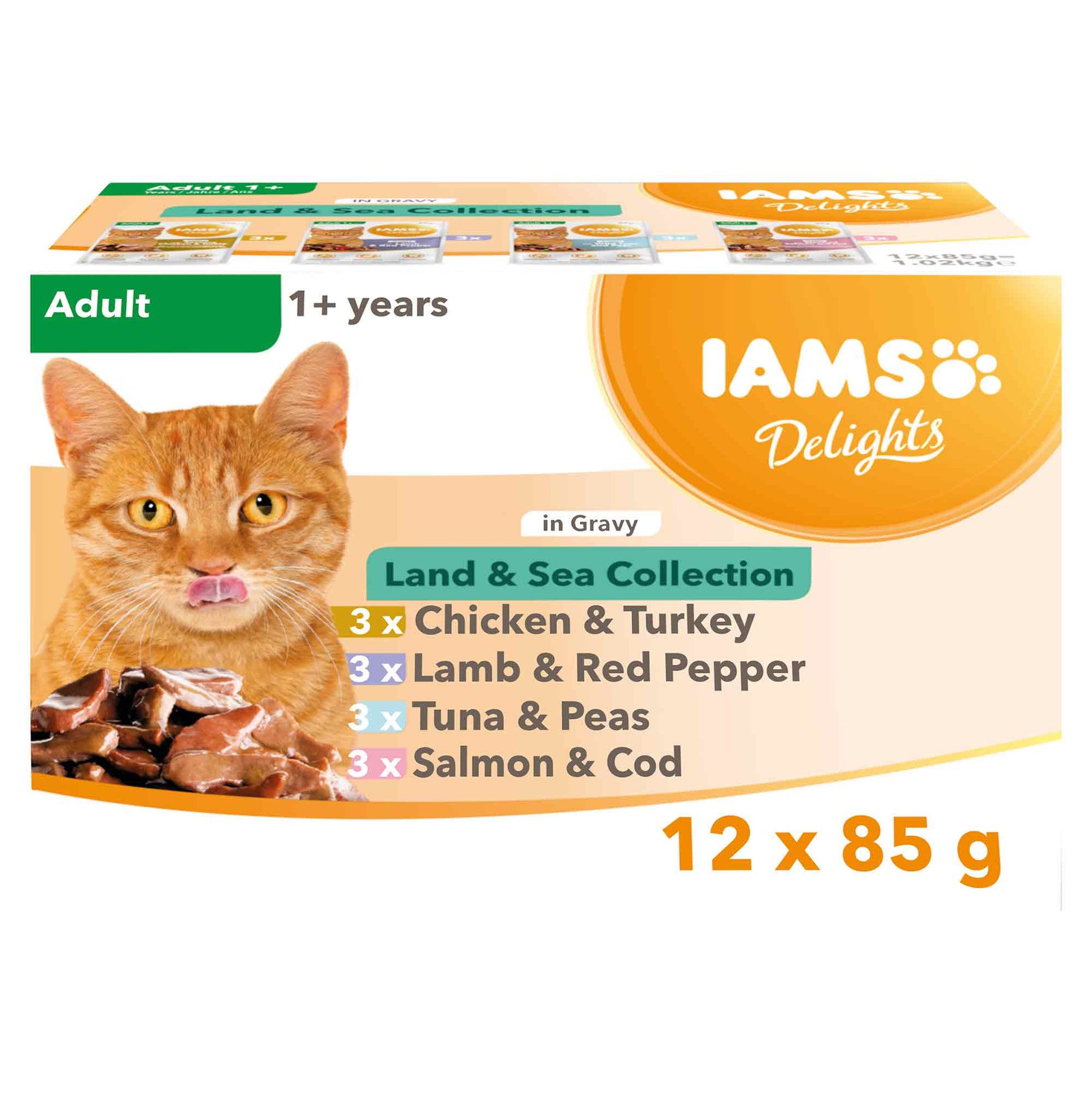 IAMS Delights Land & Sea Collection in Gravy is a 100% complete and balanced premium wet food for adult cats in a convenient multipack. The Land & Sea Collection in Gravy includes four tasty recipes that your cat will love: Savoury Chicken & Turkey, Lamb & Red Pepper, Wild Tuna & Peas and Steamed Salmon & Cod.