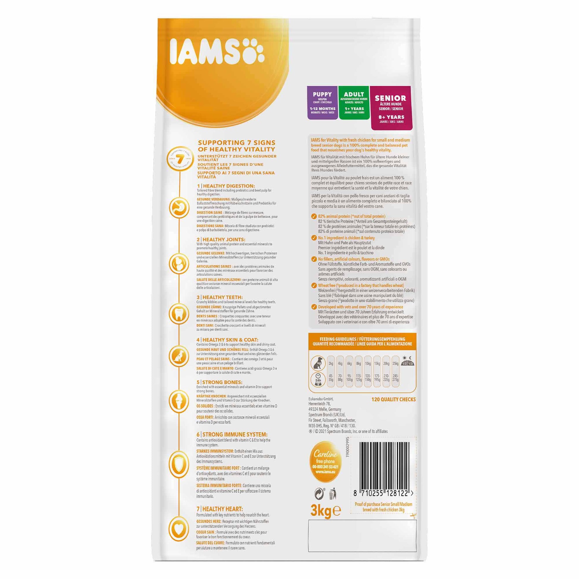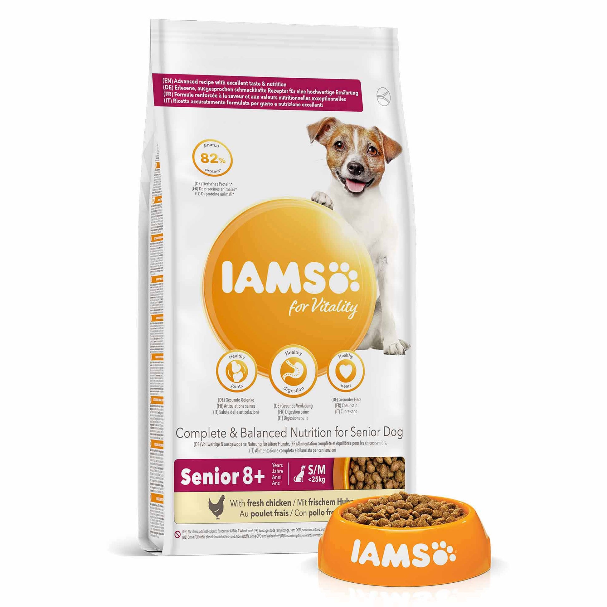 IAMS for Vitality small and medium breed senior dog food is a 100% complete and balanced expert nutrition to help support your dog’s 7 signs of healthy vitality, including keeping their digestive system in working order. All of this packed into a tasty recipe with 82% animal protein (out of total protein) for your pet to enjoy every day.