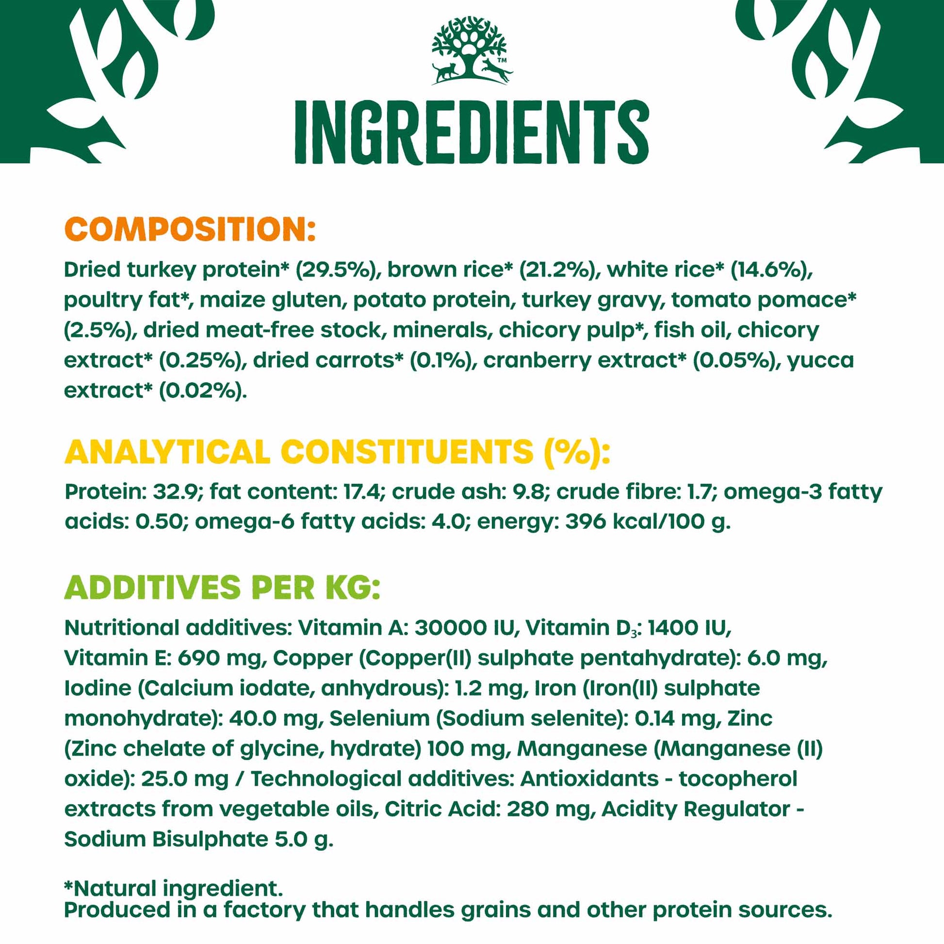 Composition: dried turkey protein* (29.5%), brown rice* (21.2%), white rice* (14.6%), poultry fat*, maize gluten, potato protein, turkey gravy, tomato pomace* (2.5%), dried meat-free stock, minerals, chicory pulp*, fish oil, chicory extract* (0.25%), dried carrots* (0.1%), cranberry extract* (0.05%), yucca extract* (0.02%). *Natural ingredient.