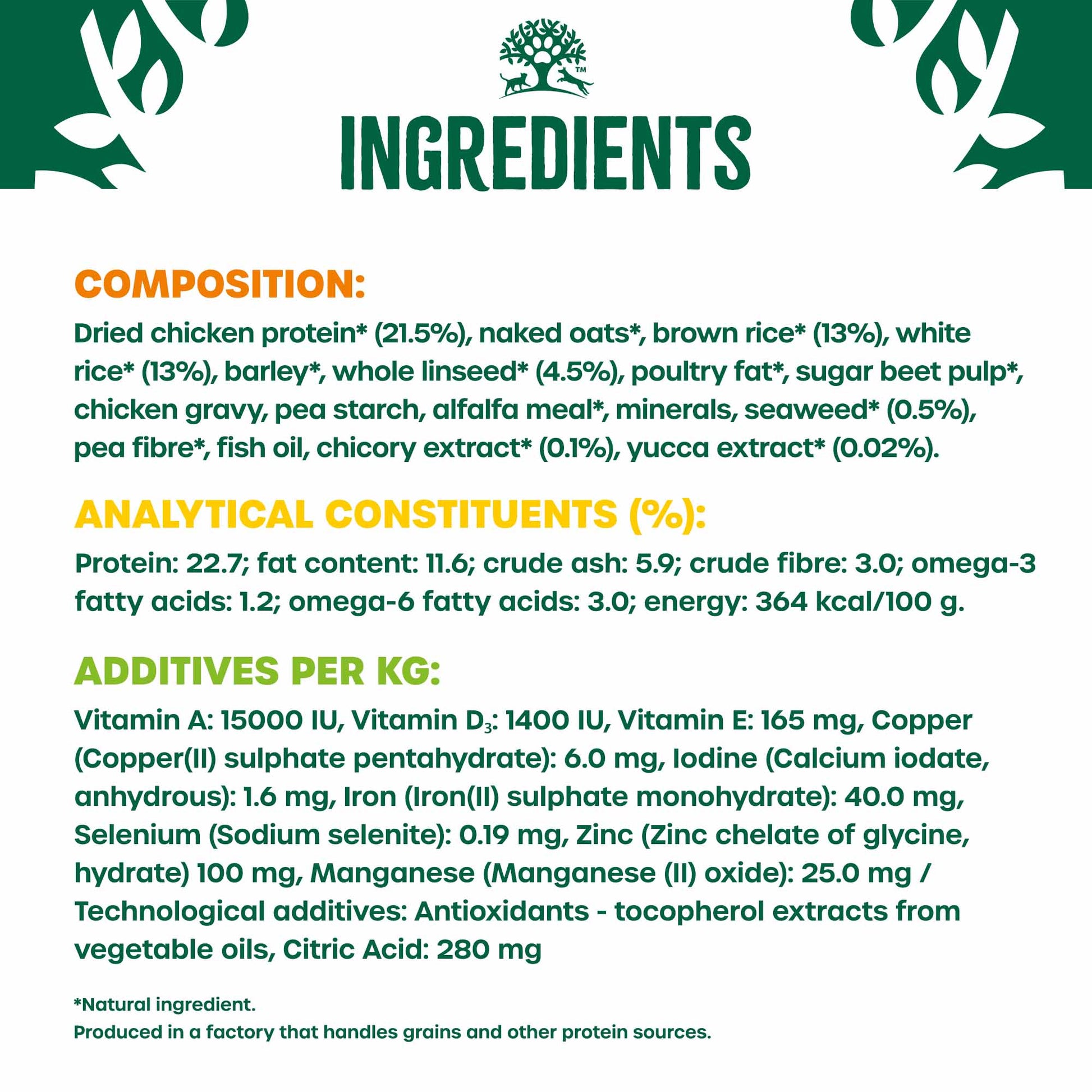Composition: dried chicken protein* (21.5%), naked oats*, brown rice* (13%), white rice* (13%), barley*, whole linseed* (4.5%), poultry fat*, sugar beet pulp*, chicken gravy, pea starch, alfalfa meal*, minerals, seaweed* (0.5%), pea fibre*, fish oil, chicory extract* (0.1%), yucca extract* (0.02%). *Natural ingredient.