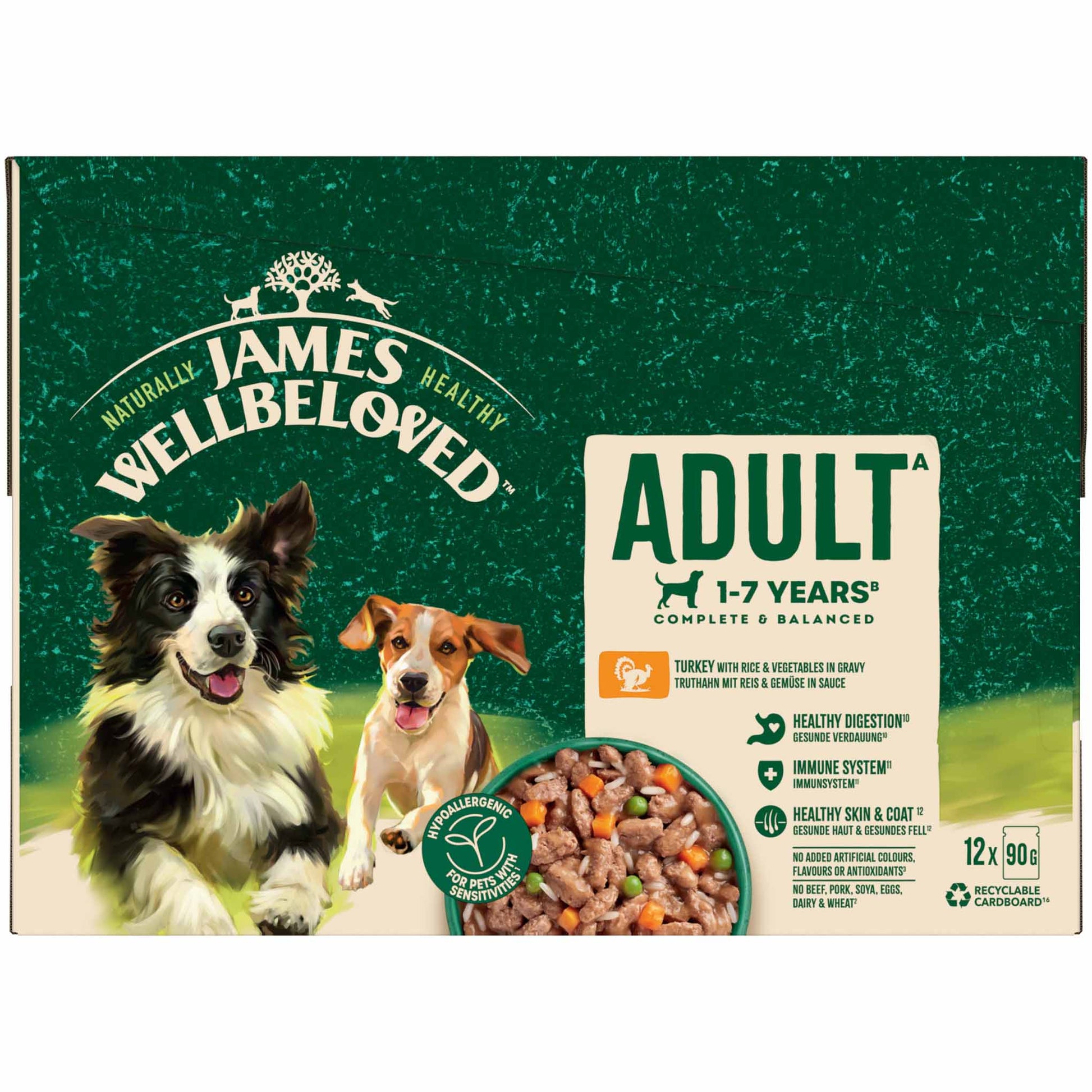 James Wellbeloved Adult Wet Dog Food in Gravy - Turkey & Rice - 12x90g Pouches