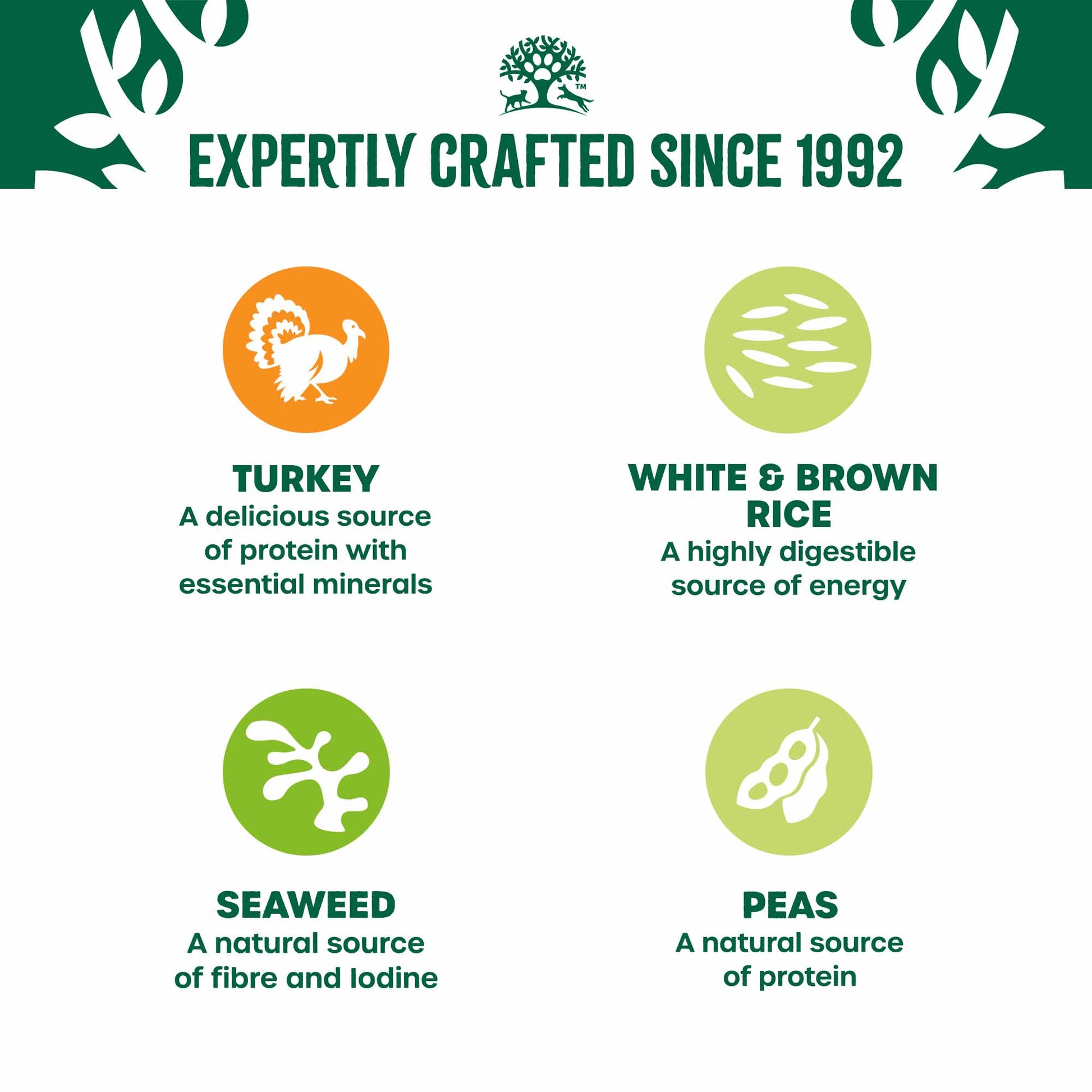 Composition: turkey* 72% in the chunk** (necks, heart, deboned ground turkey, liver), mix of white and brown rice (5.5%), dried carrots (1%, equivalent to carrots 7.3%), dried peas (1%, equivalent to peas 3.6%), oils and fats (including linseed oil 0.25%), dextrose, minerals, dried beet pulp, seaweed (0.11%), cellulose, tomato powder. *100% natural. **Chunk typically 37.5% of the product.Produced in a factory that handles grains and other protein sources.