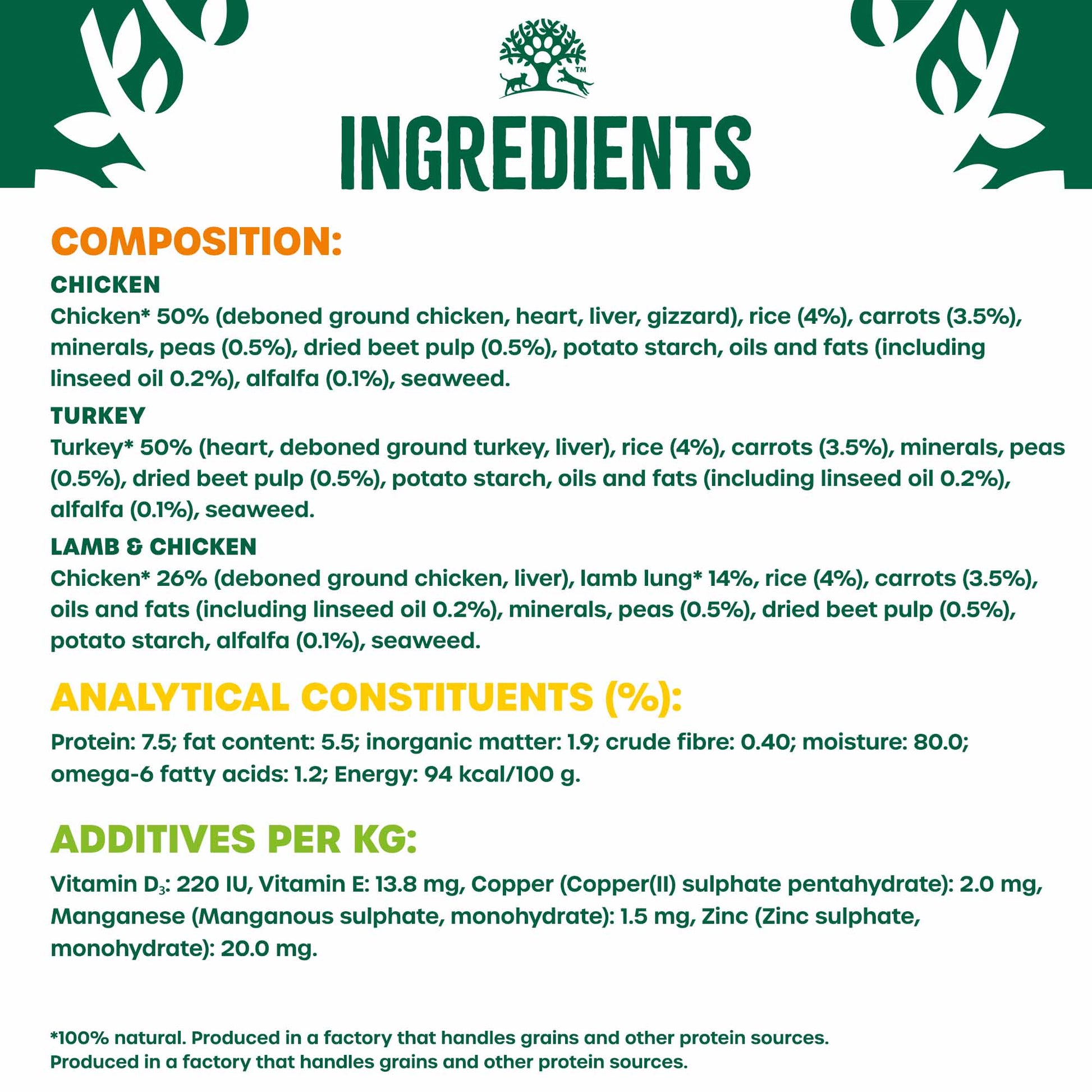 Chicken&Lamb: chicken* 36% (deboned ground chicken, heart, liver), lamb lung* 14%, rice (4%), carrots (3.5%), oils and fats (including linseed oil 0.2%), minerals, dried beet pulp (0.5%), peas (0.5%), potato starch, alfalfa (0.1%), seaweed (0.1%). *100% natural.