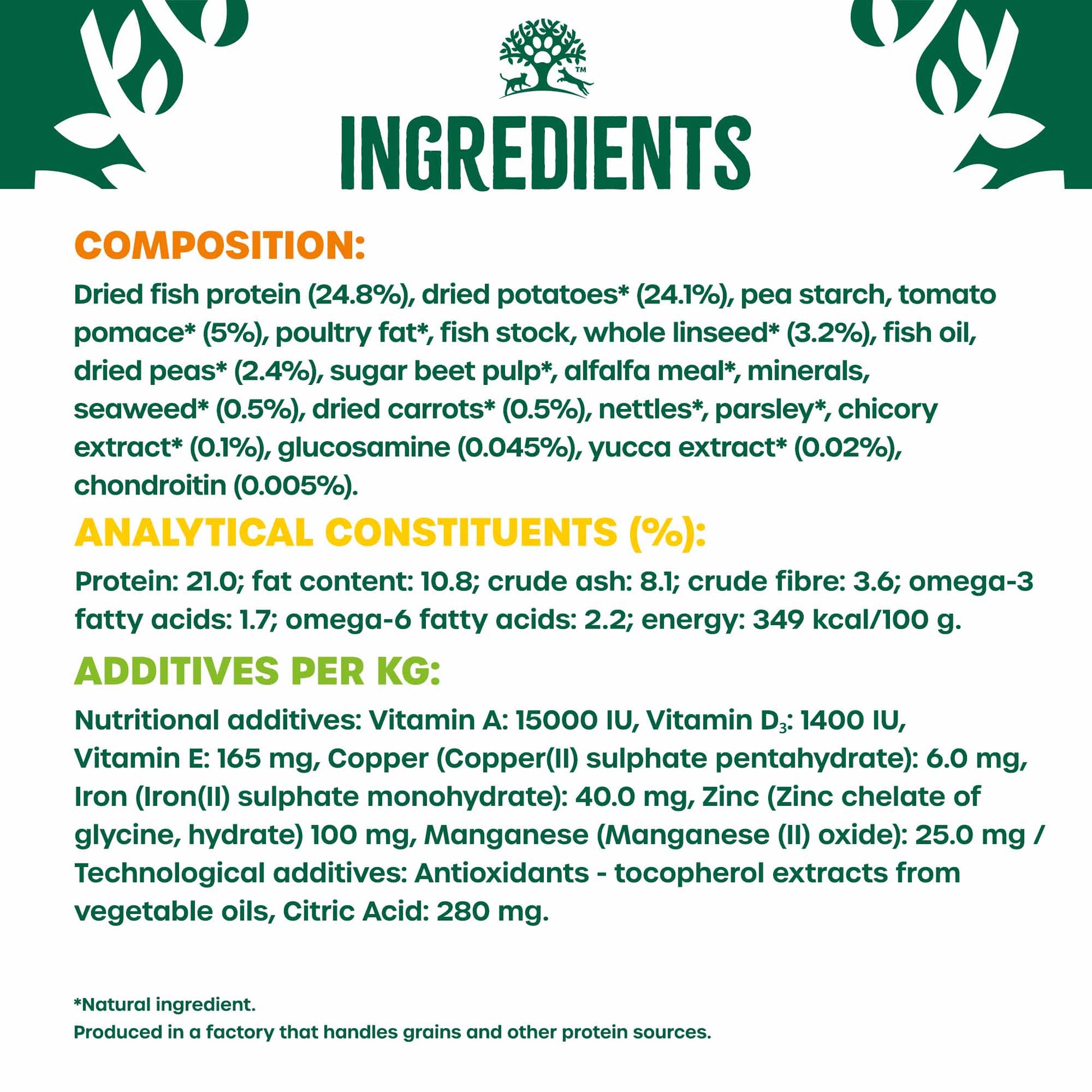 Composition: dried fish protein (24.8%), dried potatoes* (24.1%), pea starch, tomato pomace* (5%), poultry fat*, fish stock, whole linseed* (3.2%), fish oil, dried peas* (2.4%), sugar beet pulp*, alfalfa meal*, minerals, seaweed* (0.5%), dried carrots* (0.5%), nettles*, parsley*, chicory extract* (0.1%), glucosamine (0.045%), yucca extract* (0.02%), chondroitin (0.005%). *Natural ingredient.Produced in a factory that handles grains and other protein sources.