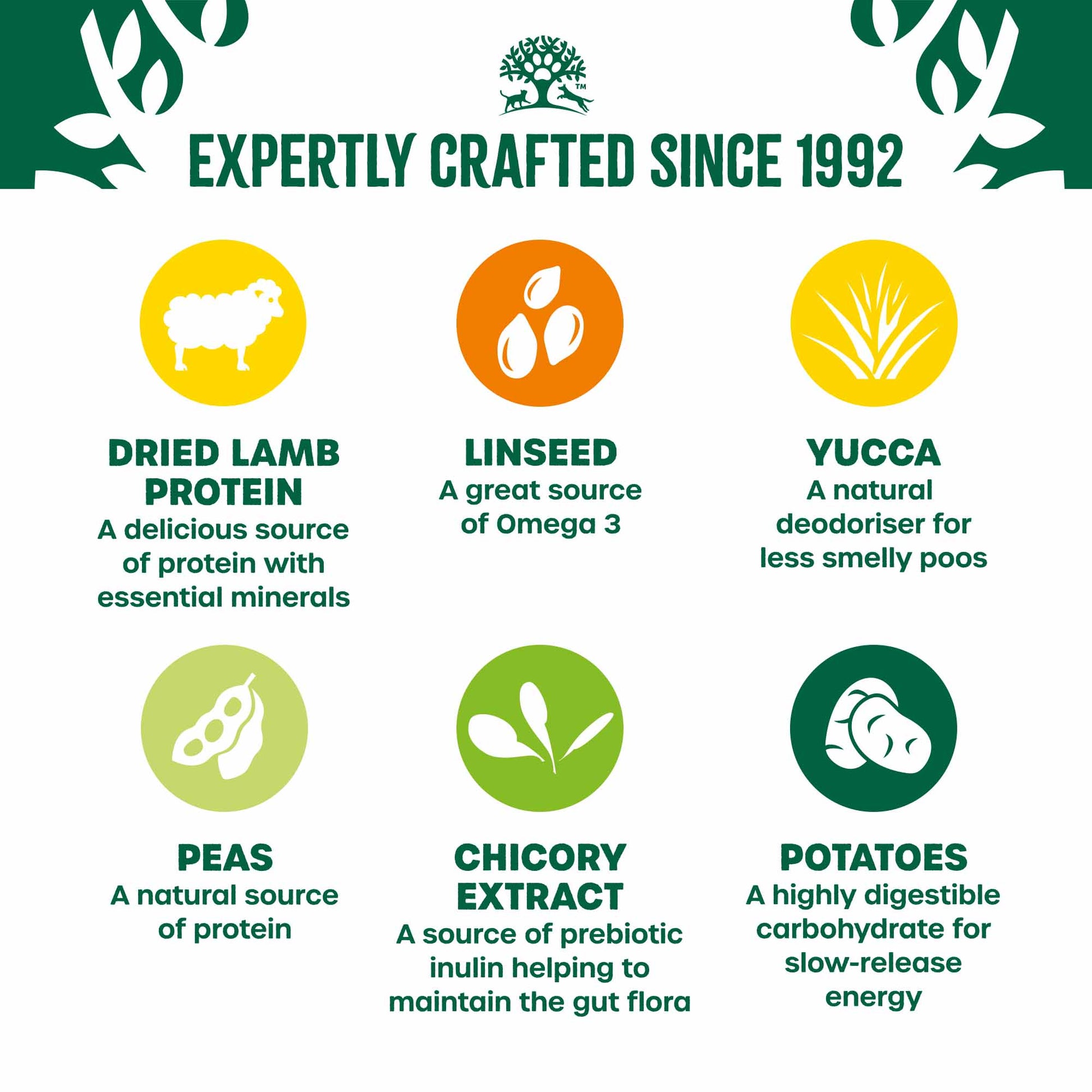 Composition: dried lamb protein* (25.5%), pea starch, dried potatoes* (21.8%), tomato pomace* (5%), poultry fat*, pea protein, whole linseed* (3.4%), lamb gravy, dried peas* (2.5%), sugar beet pulp*, alfalfa meal*, seaweed* (0.5%), dried carrots* (0.5%), minerals, fish oil, nettles*, parsley*, chicory extract* (0.1%), glucosamine (0.045%), yucca extract* (0.02%), chondroitin (0.005%). *Natural ingredient.