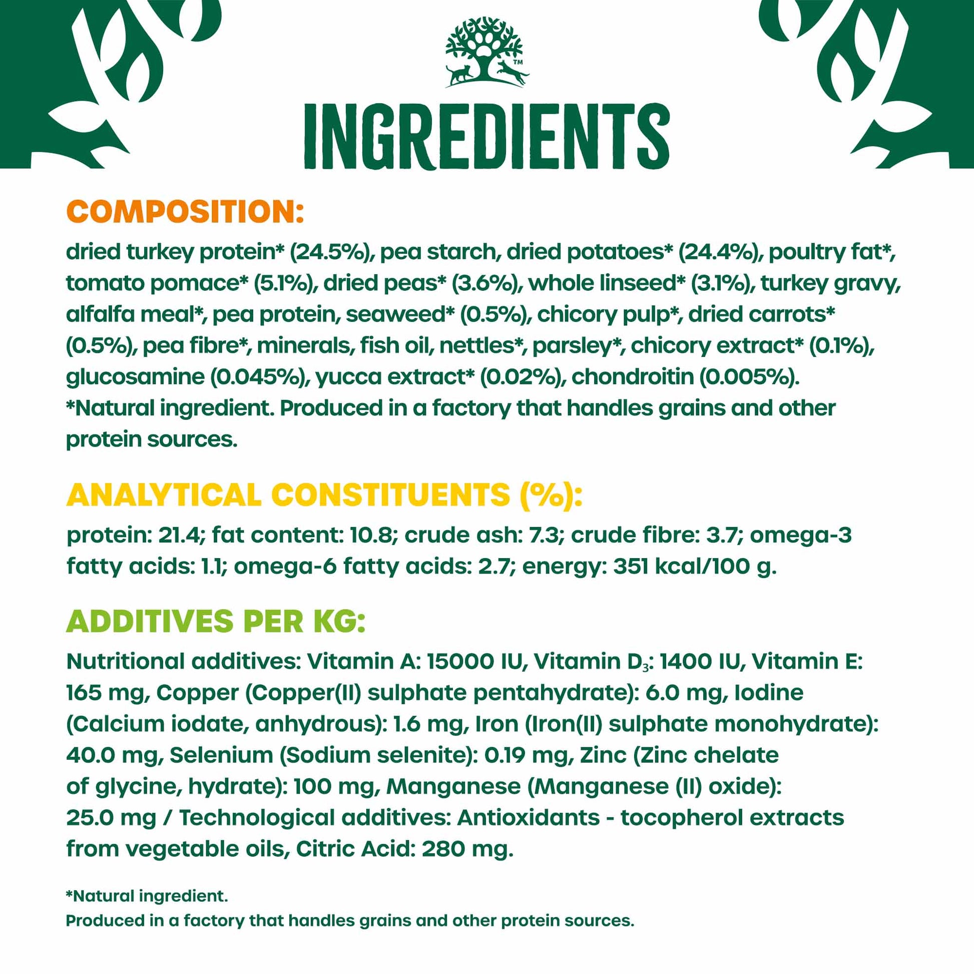 Composition: dried turkey protein* (24.5%), pea starch, dried potatoes* (24.4%), poultry fat*, tomato pomace* (5.1%), dried peas* (3.6%), whole linseed* (3.1%), turkey gravy, alfalfa meal*, pea protein, seaweed* (0.5%), chicory pulp*, dried carrots* (0.5%), pea fibre*, minerals, fish oil, nettles*, parsley*, chicory extract* (0.1%), glucosamine (0.045%), yucca extract* (0.02%), chondroitin (0.005%). *Natural ingredient.