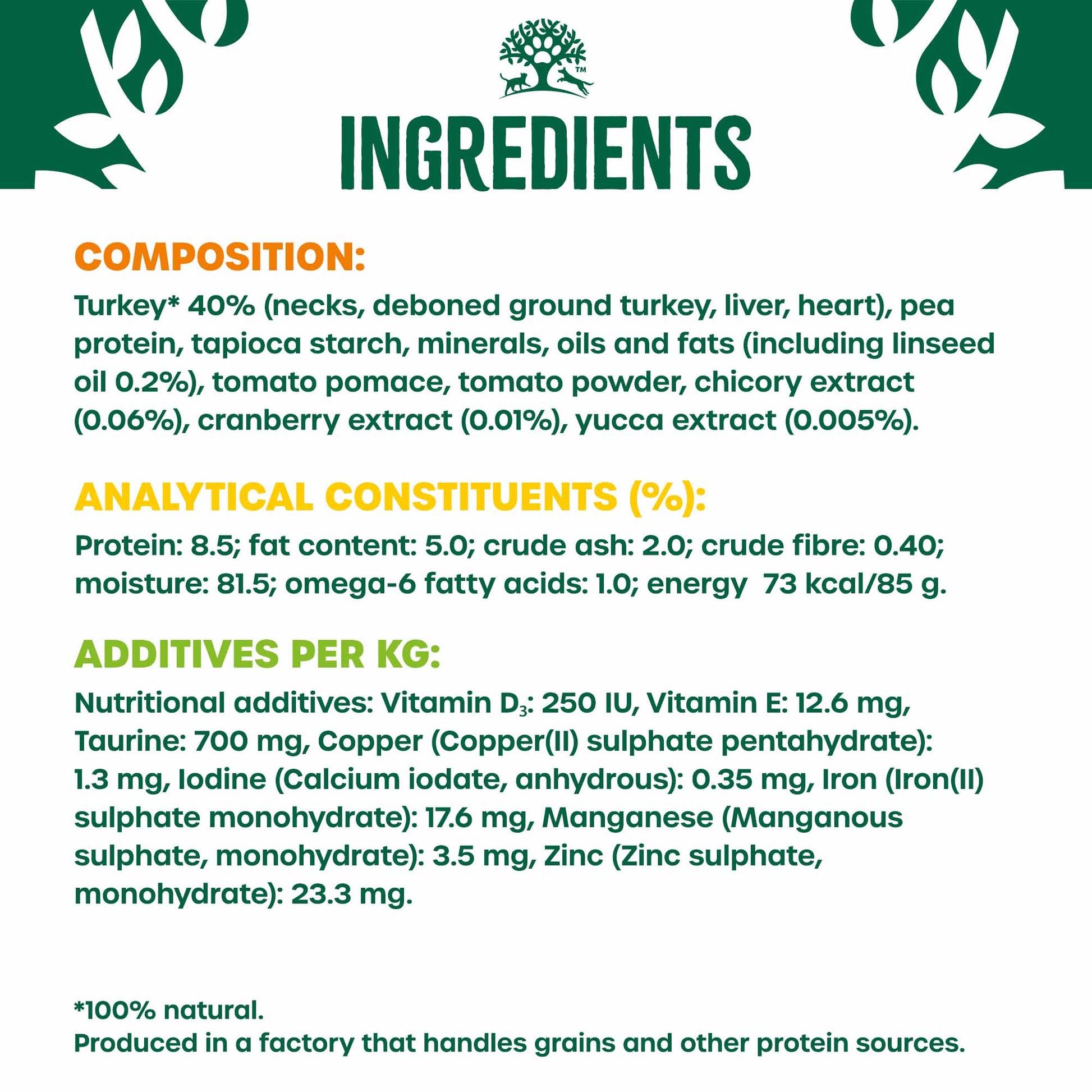 Composition:turkey* 40% (necks, deboned ground turkey, liver, heart), pea protein, tapioca starch, minerals, oils and fats (including linseed oil 0.2%), tomato pomace, tomato powder, chicory extract (0.06%), cranberry extract (0.01%), yucca extract (0.005%). *100% natural.