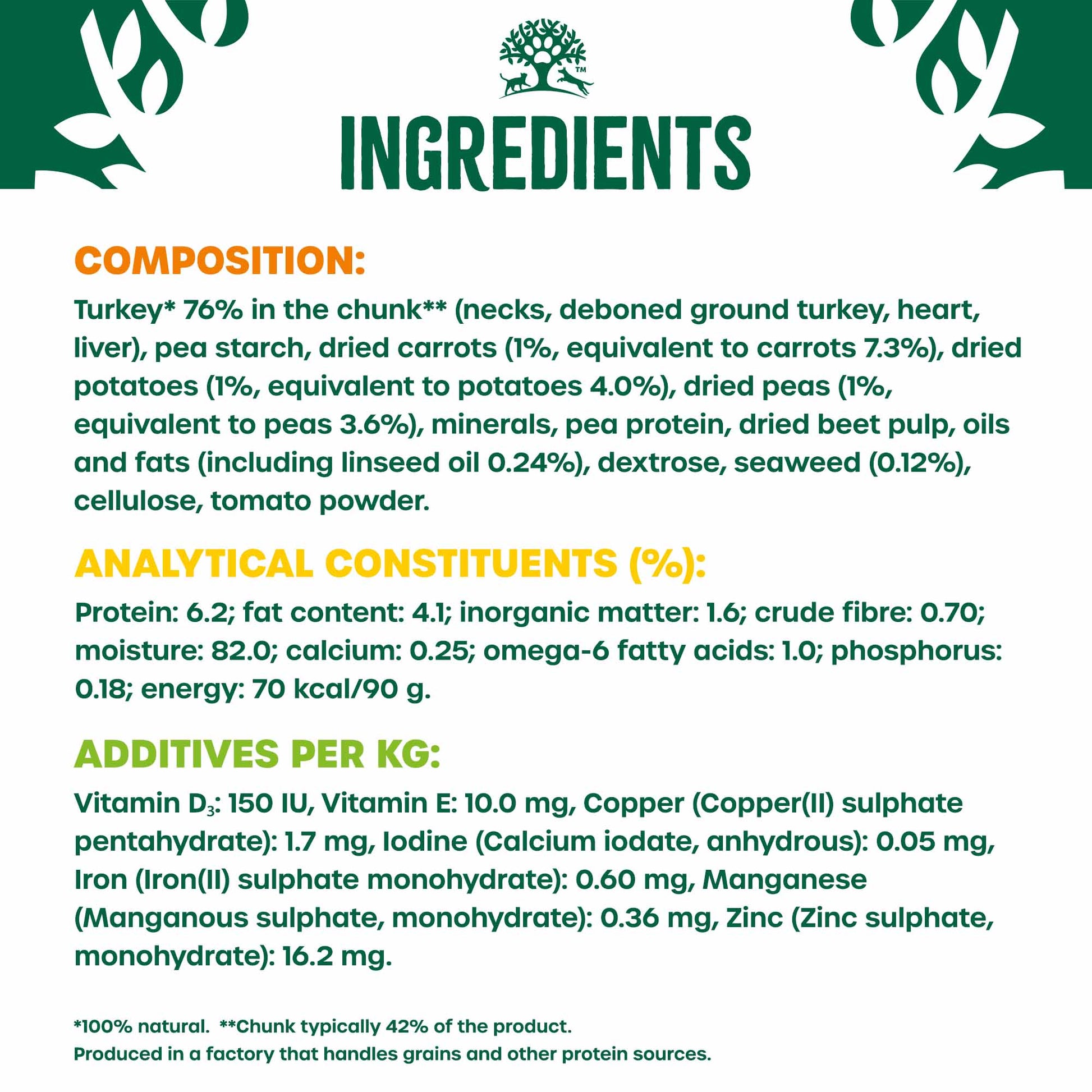 Composition: turkey* 76% in the chunk** (necks, deboned ground turkey, heart, liver), pea starch, dried carrots (1%, equivalent to carrots 7.3%), dried potatoes (1%, equivalent to potatoes 4%), dried peas (1%, equivalent to peas 3.6%), minerals, pea protein, dried beet pulp, oils and fats (including linseed oil 0.24%), dextrose, seaweed (0.12%), cellulose, tomato powder. *100% natural. **Chunk typically 42% of the product.