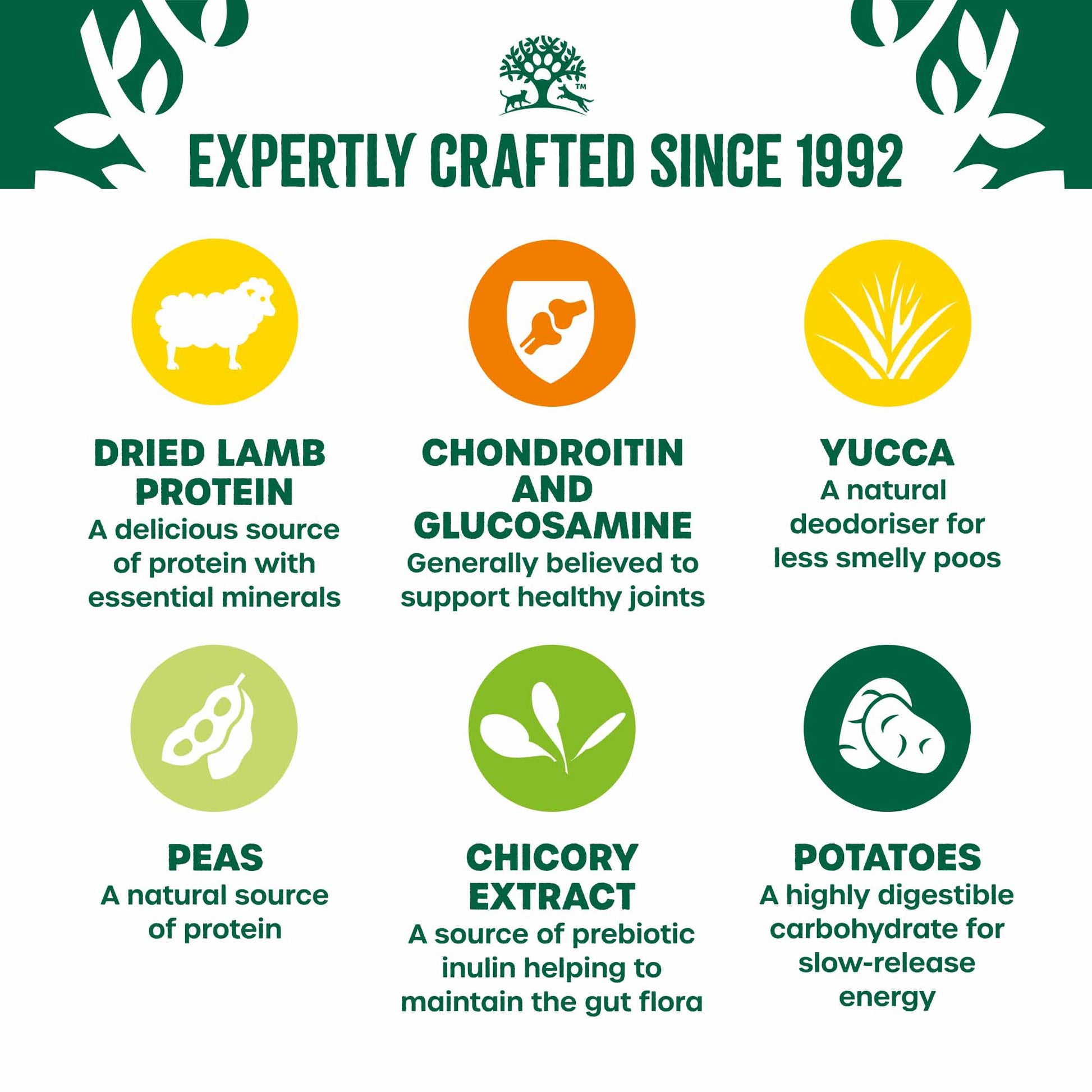 Composition: pea starch, dried lamb protein* (23.5%), dried potatoes* (22.6%), tomato pomace* (5%), pea protein, poultry fat*, whole linseed* (3.2%), lamb gravy, dried peas* (2.6%), sugar beet pulp*, alfalfa meal*, seaweed* (0.5%), dried carrots* (0.5%), pea fibre*, minerals, fish oil, nettles*, parsley*, chicory extract* (0.1%), glucosamine (0.045%), yucca extract* (0.02%), chondroitin (0.005%). *Natural ingredient.