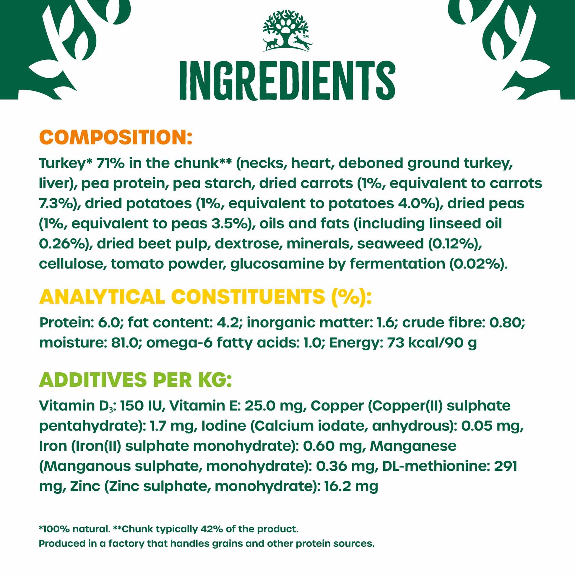 Composition: turkey* 71% in the chunk** (necks, heart, deboned ground turkey, liver), pea protein, pea starch, dried carrots (1%, equivalent to carrots 7.3%), dried potatoes (1%, equivalent to potatoes 4.0%), dried peas (1%, equivalent to peas 3.5%), oils and fats (including linseed oil 0.26%), dried beet pulp, dextrose, minerals, seaweed (0.12%), cellulose, tomato powder, glucosamine by fermentation (0.02%). *100% natural. **Chunk typically 42% of the product.