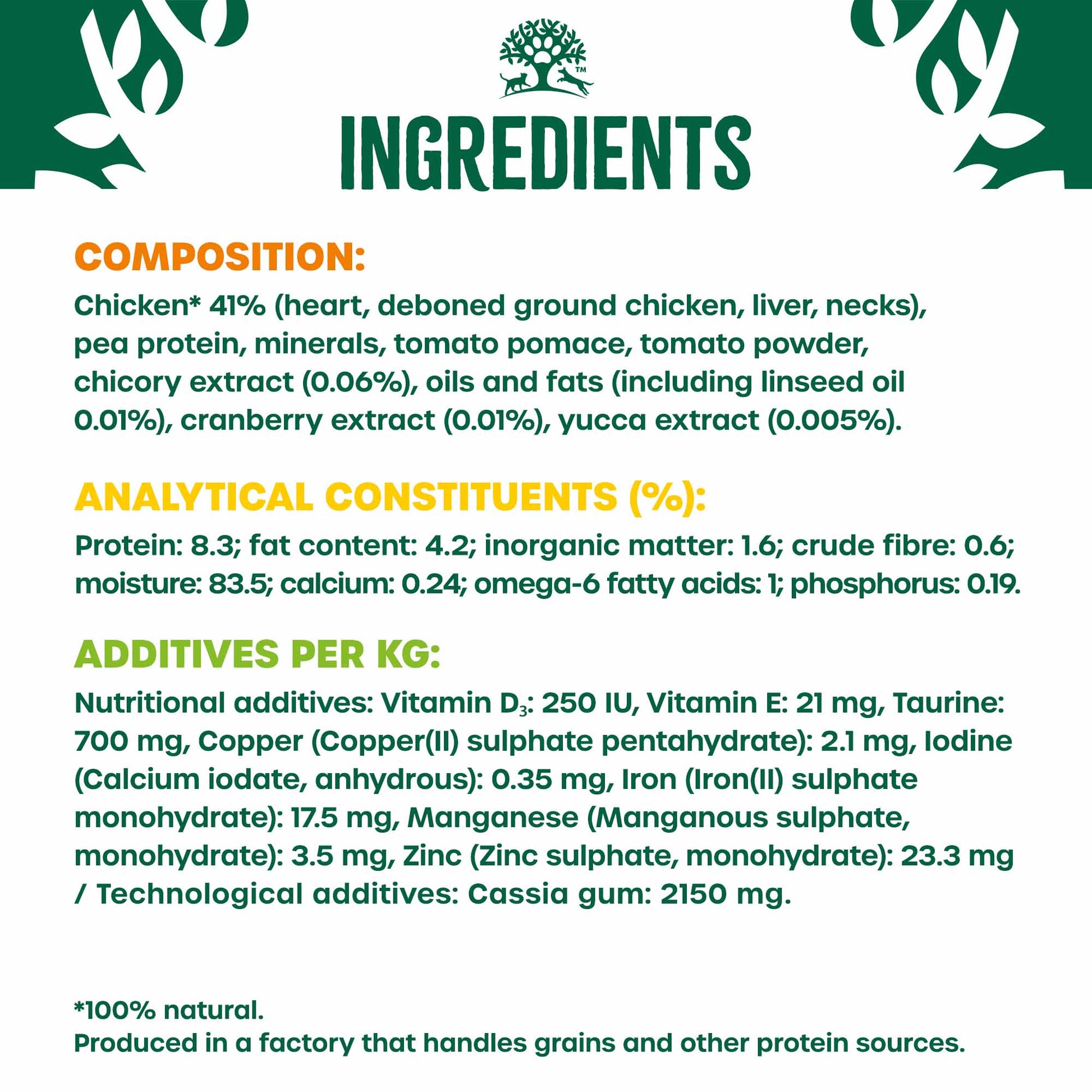 Composition: chicken* 41% (heart, deboned ground chicken, liver, necks), pea protein, minerals, tomato pomace, tomato powder, chicory extract (0.06%), oils and fats (including linseed oil 0.01%), cranberry extract (0.01%), yucca extract (0.005%). *100% natural.