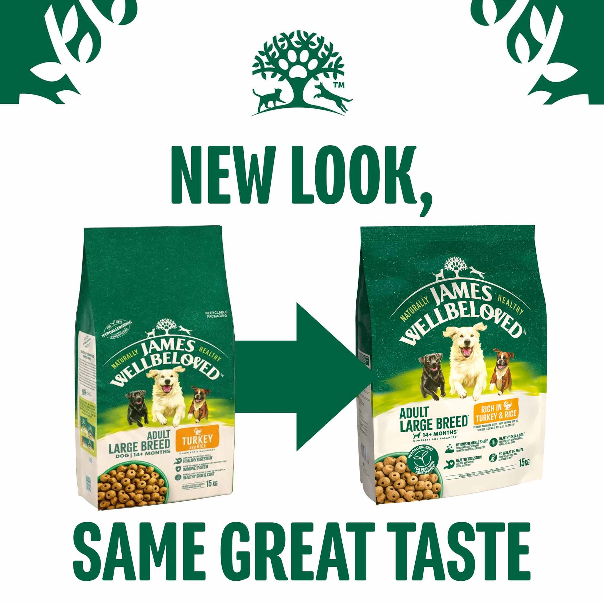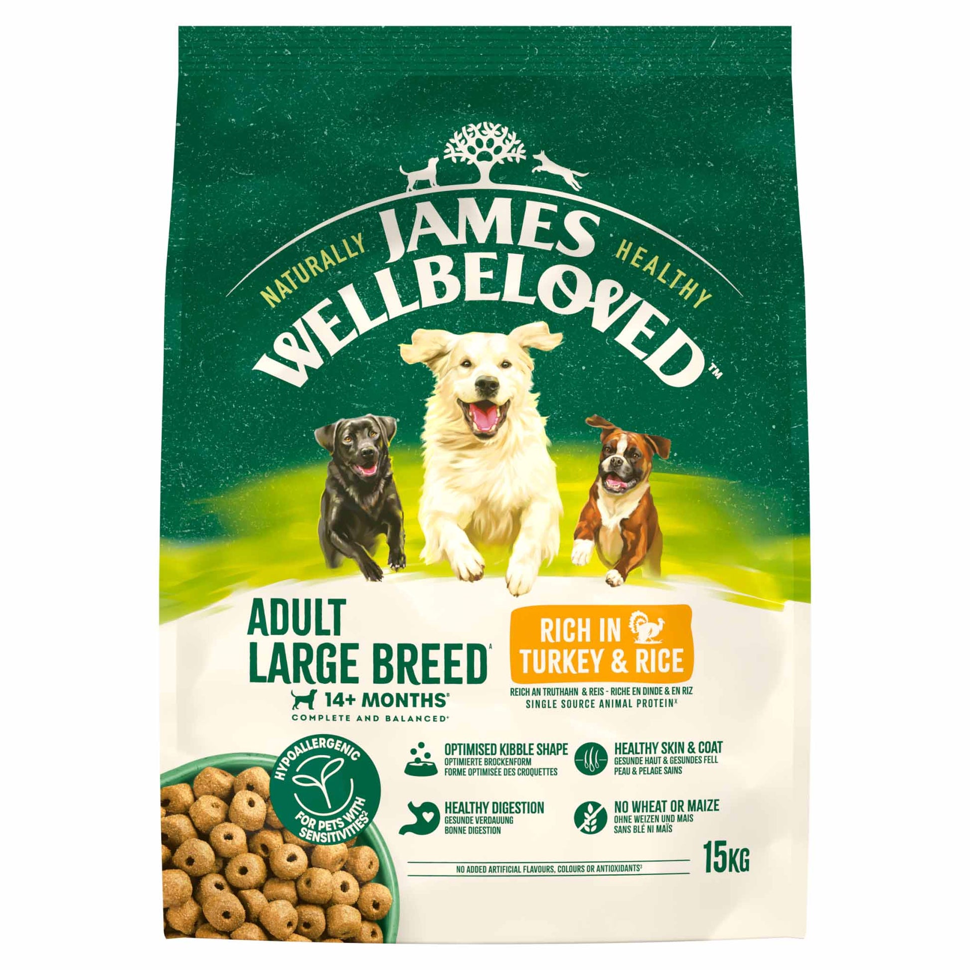 James Wellbeloved Large Breed Adult Dog Food is crafted with a handful of nature's nourishing ingredients and combined with flavourful turkey to create highly digestible, tasty dry dog food. Our optimised kibble shapes suit large breed dogs. You can be sure that they're enjoying a balanced diet. One that not only tastes good but does them a world of good too.rafted with a handful of nature's nourishing ingredients and combined with flavourful turkey to create highly digestible, tasty dry dog food. Our optimised kibble shapes suit large breed dogs. You can be sure that they're enjoying a balanced diet. One that not only tastes good but does them a world of good too.