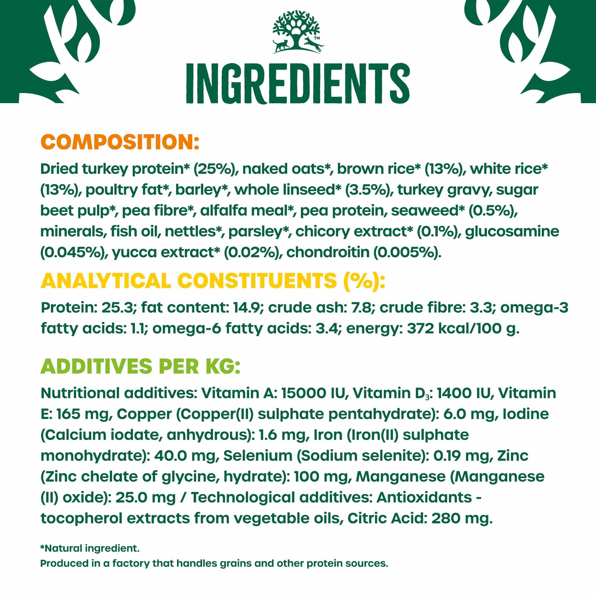 Composition: dried turkey protein* (25%), naked oats*, brown rice* (13%), white rice* (13%), poultry fat*, barley*, whole linseed* (3.5%), turkey gravy, sugar beet pulp*, pea fibre*, alfalfa meal*, pea protein, seaweed* (0.5%), minerals, fish oil, nettles*, parsley*, chicory extract* (0.1%), glucosamine (0.045%), yucca extract* (0.02%), chondroitin (0.005%). *Natural ingredient.