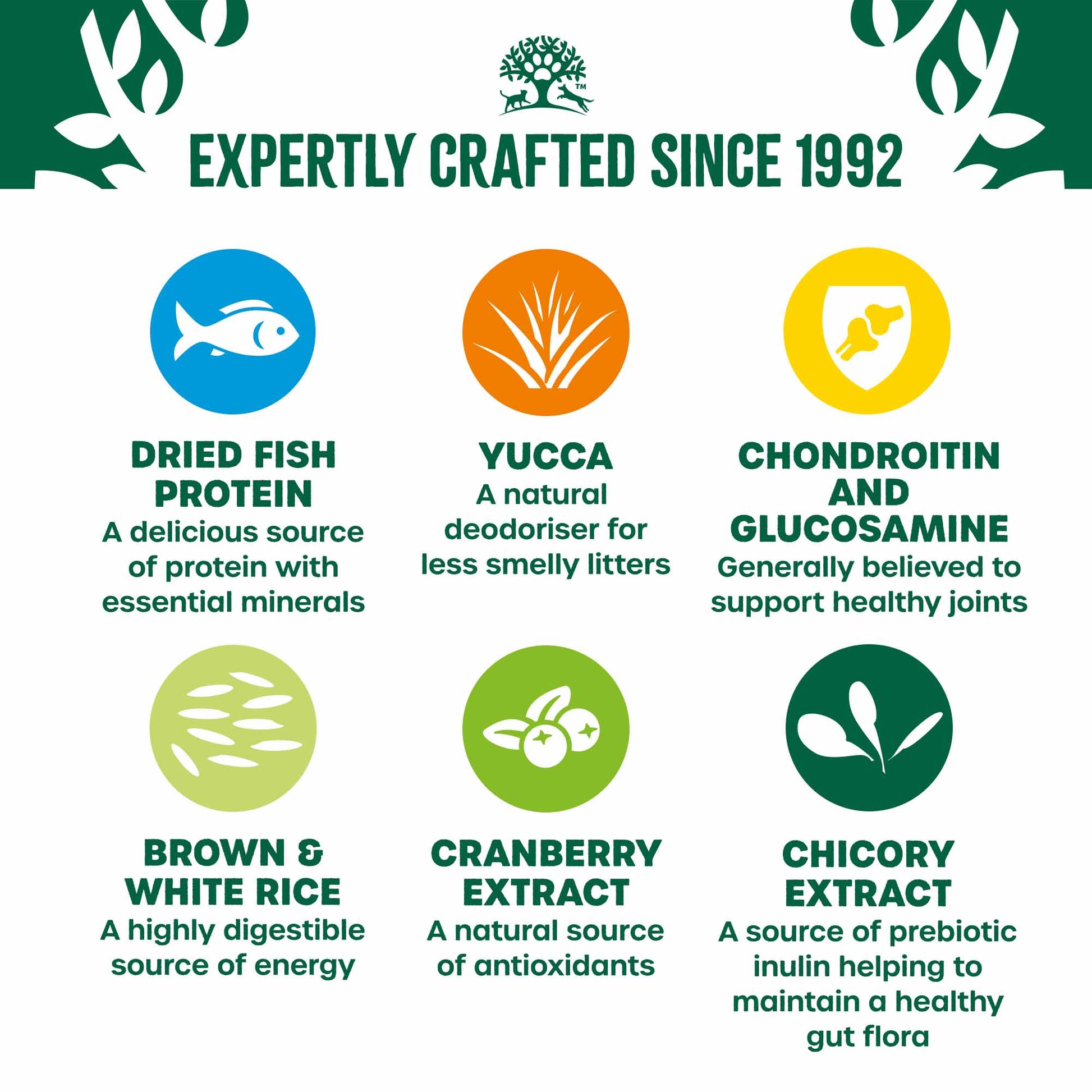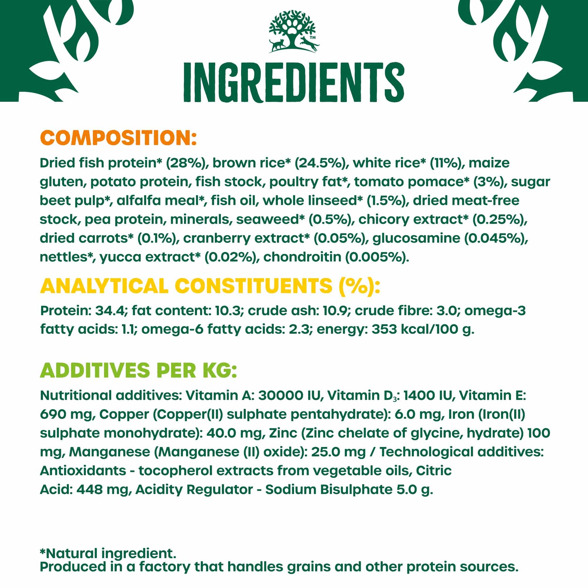 Composition: dried fish protein* (28%), brown rice* (24.5%), white rice* (11%), maize gluten, potato protein, fish stock, poultry fat*, tomato pomace* (3%), sugar beet pulp*, alfalfa meal*, fish oil, whole linseed* (1.5%), dried meat-free stock, pea protein, minerals, seaweed* (0.5%), chicory extract* (0.25%), dried carrots* (0.1%), cranberry extract* (0.05%), glucosamine (0.045%), nettles*, yucca extract* (0.02%), chondroitin (0.005%). *Natural ingredient.