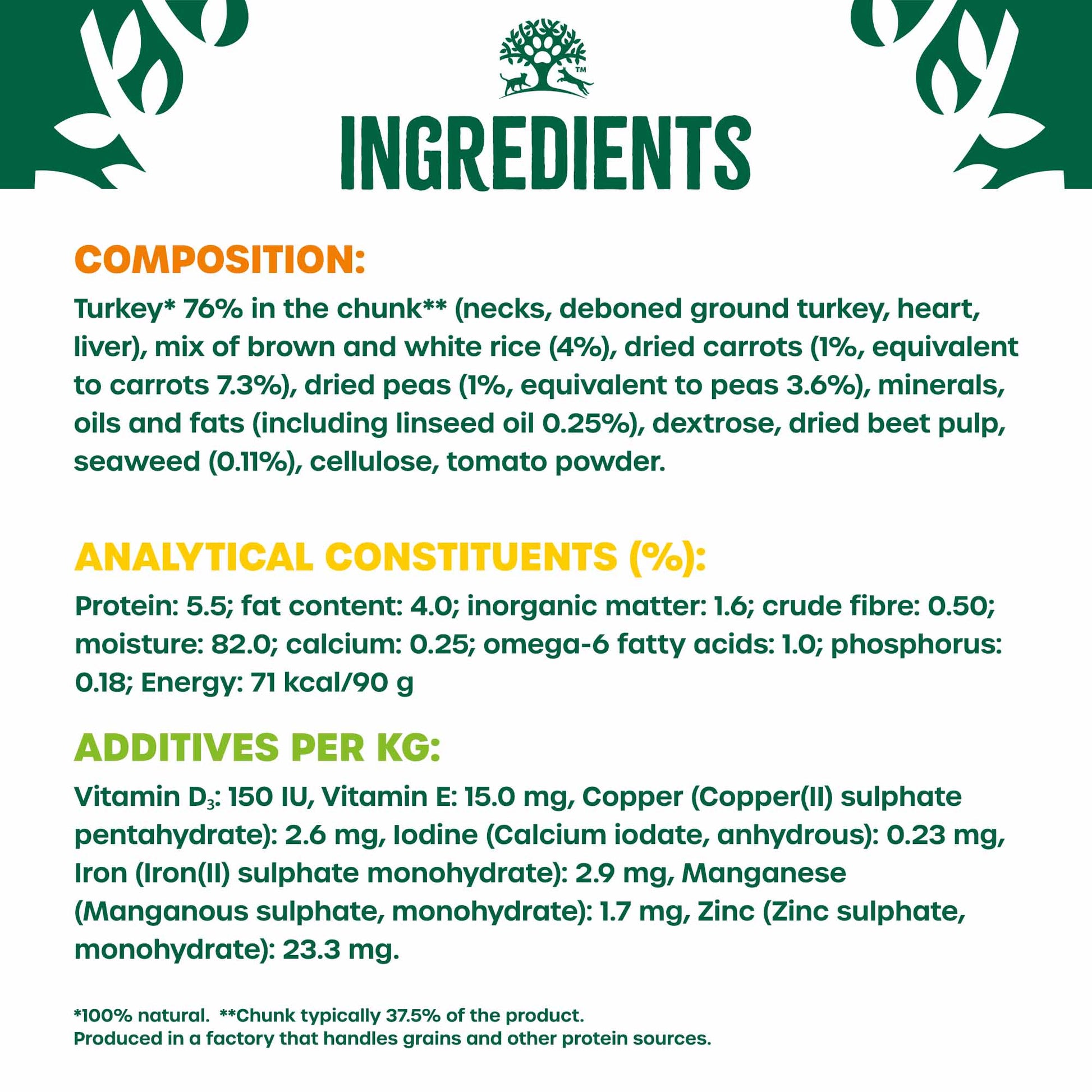 Composition: turkey* 76% in the chunk** (necks, deboned ground turkey, heart, liver), mix of brown and white rice (4%), dried carrots (1%, equivalent to carrots 7.3%), dried peas (1%, equivalent to peas 3.6%), minerals, oils and fats (including linseed oil 0.25%), dextrose, dried beet pulp, seaweed (0.11%), cellulose, tomato powder. *100% natural. **Chunk typically 37.5% of the product.