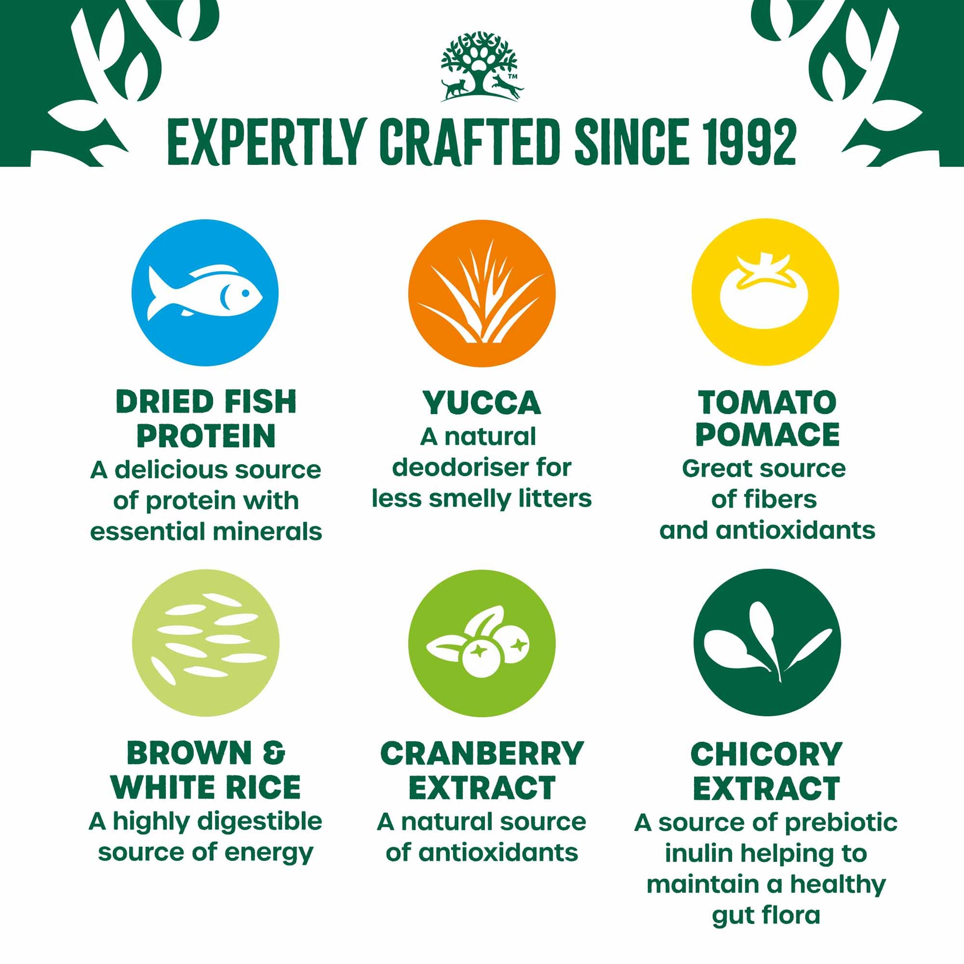 Composition: dried fish protein* (18.6%), brown rice* (18.3%), white rice* (18.2%), maize gluten, poultry fat*, pea protein, potato protein, fish oil, fish stock, tomato pomace* (2.5%), dried carrots* (1.1%), dried meat-free stock, minerals, chicory pulp*, chicory extract* (0.25%), cranberry extract* (0.05%), glucosamine (0.045%), nettles*, yucca extract* (0.02%), chondroitin (0.005%). *Natural ingredient.