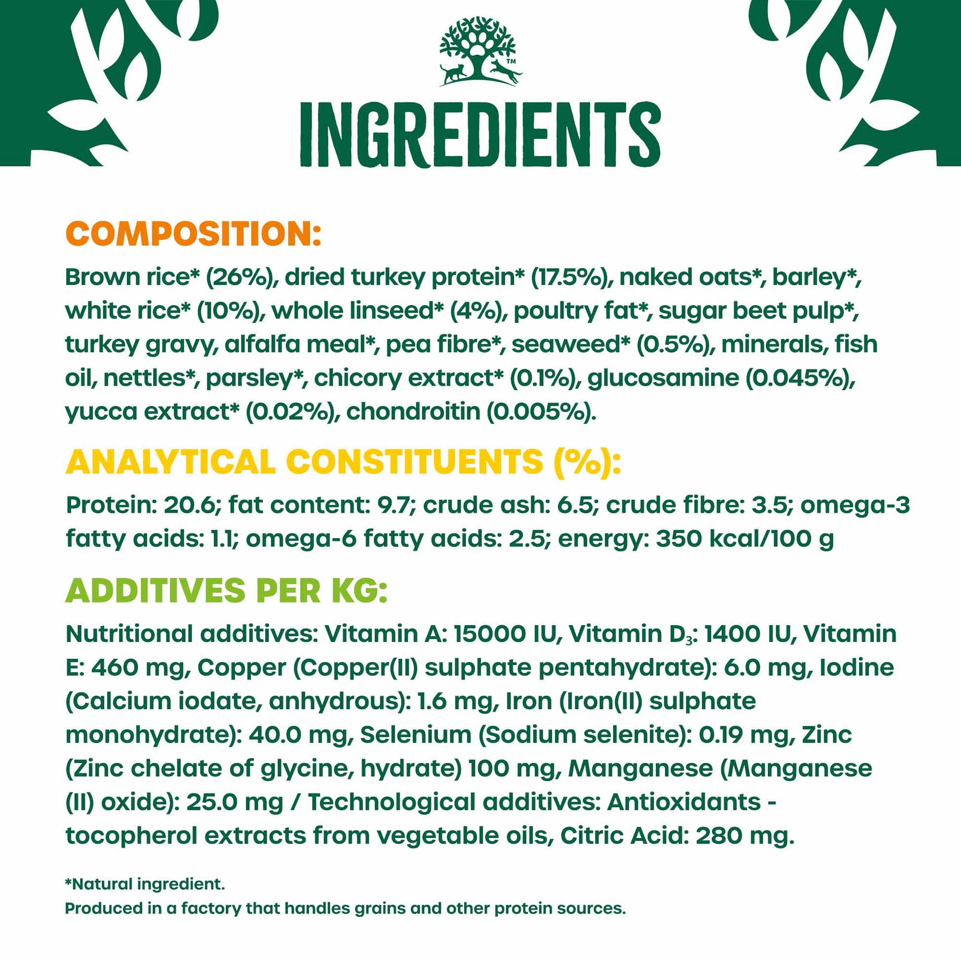 Composition: brown rice* (26%), dried turkey protein* (17.5%), naked oats*, barley*, white rice* (10%), whole linseed* (4%), poultry fat*, sugar beet pulp*, turkey gravy, alfalfa meal*, pea fibre*, seaweed* (0.5%), minerals, fish oil, nettles*, parsley*, chicory extract* (0.1%), glucosamine (0.045%), yucca extract* (0.02%), chondroitin (0.005%). *Natural ingredient.