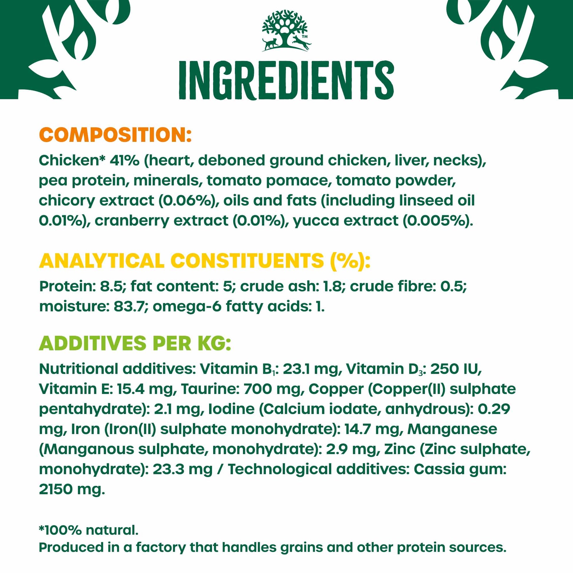 Composition: chicken* 41% (heart, deboned ground chicken, liver, necks), pea protein, minerals, tomato pomace, tomato powder, chicory extract (0.06%), oils and fats (including linseed oil 0.01%), cranberry extract (0.01%), yucca extract (0.005%). *100% natural.