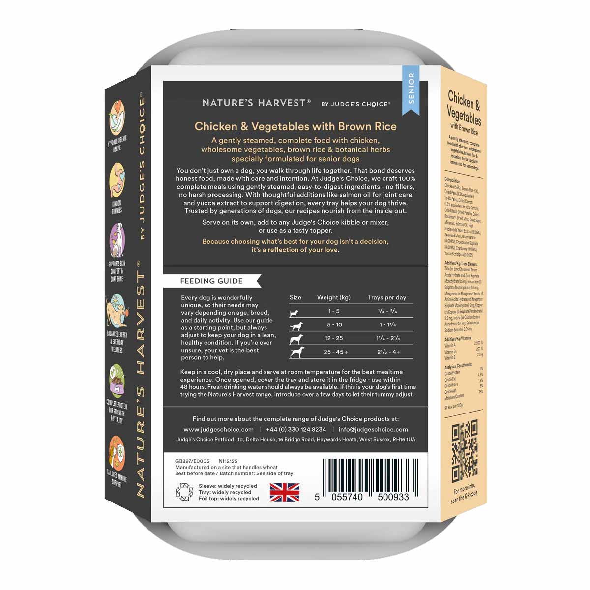 Ideal for older dogs, Nature’s Harvest Adult Dog Senior Food Trays contain gently steamed chicken with brown rice and vegetables. Formulated to match your dog’s natural diet and using only the finest natural ingredients, each tray is a natural holistic, hypoallergenic and complete food that is especially ideal for older dogs with a dietary sensitivity.