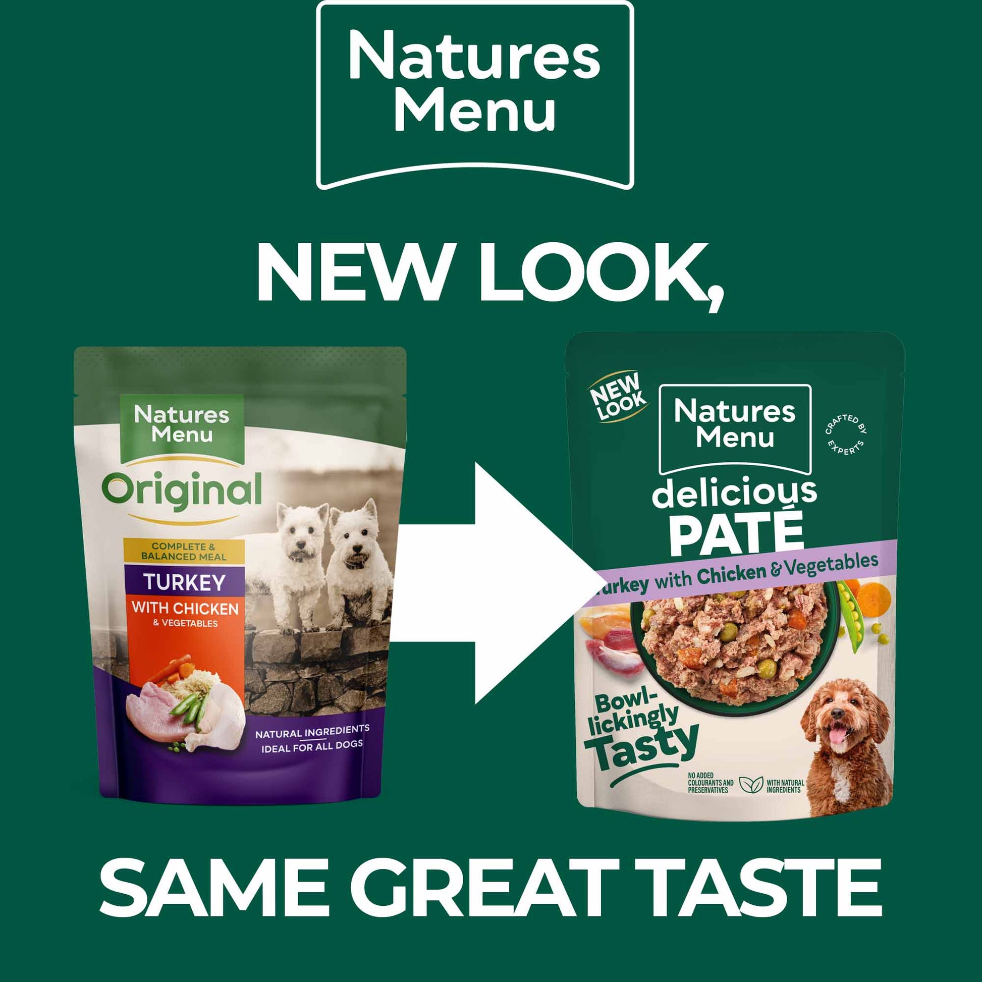 Natures Menu Original recipes are packed with good, honest ingredients to give your pet the essential nourishment it needs. These complete and balanced pouches are made with quality turkey and chicken, blended with vegetables, rice and essential vitamins and minerals to ensure your dog’s bowl is packed with nutritional goodness.