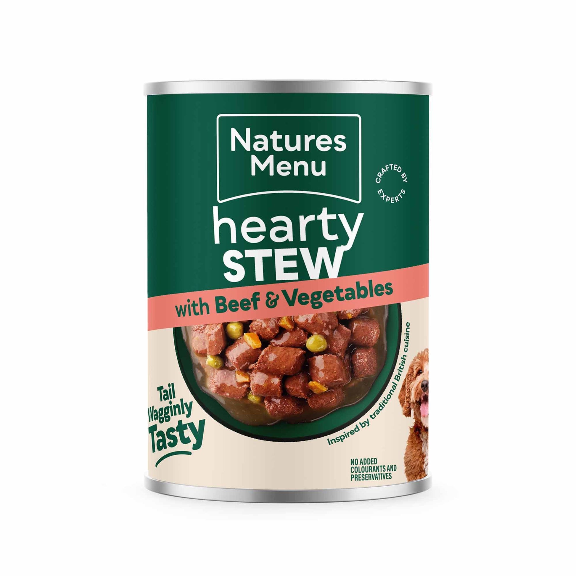 It’s tail-waggingly tasty! Natures Menu Hearty Stew with beef chunks and veggies is inspired by traditional British cuisine, for a mouth-watering meal your dog will adore.