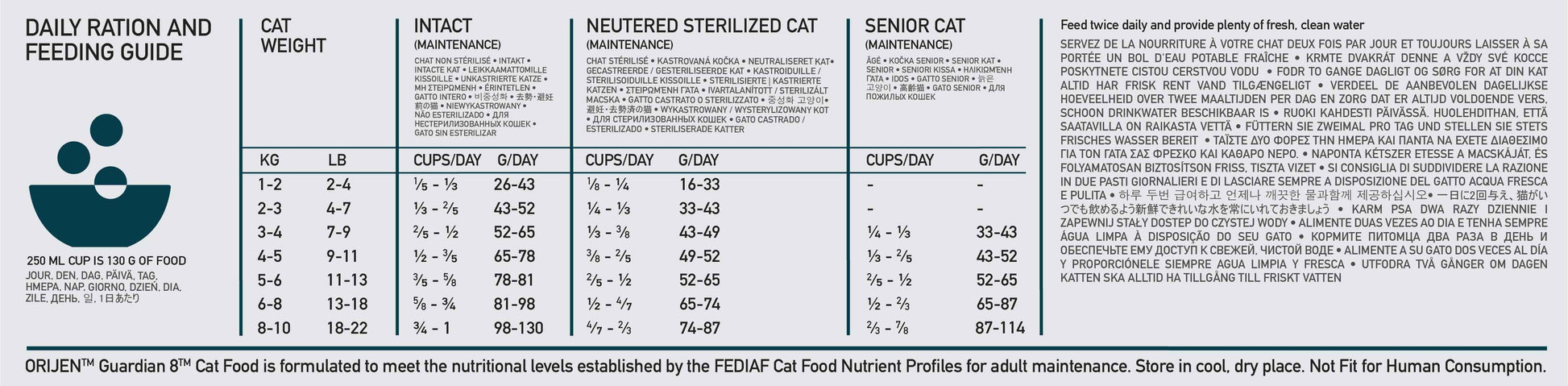 ORIJEN Guardian 8 is a nourishing food specially formulated through quality ingredients. Because of the abundance of fresh and raw WholePrey animal ingredients in this diet, less supplementation is needed to support your cat’s health for a lifetime. With 90%* premium animal ingredients, and 2/3 of those being fresh and raw, Guardian 8 contains nutritious ingredients that help support your cat’s overall health with 8 benefits. These benefits include Immune support, Digestive health support, Healthy skin & coat support, Muscle maintenance, Heart health, Joint health, Brain & cognitive function, and Eye health.