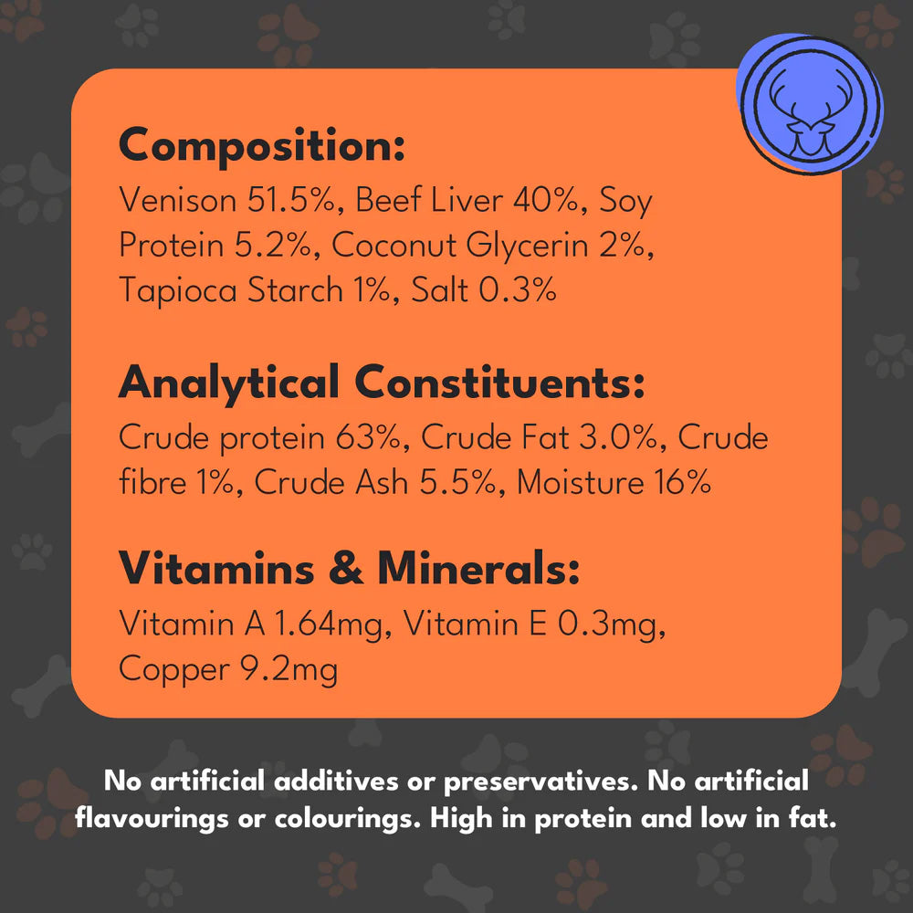 Made from 100% natural quality venison & liver. Designed to satisfy your dog's natural instinct to chew, these can help to reduce tartar and plaque for healthy teeth and gums.