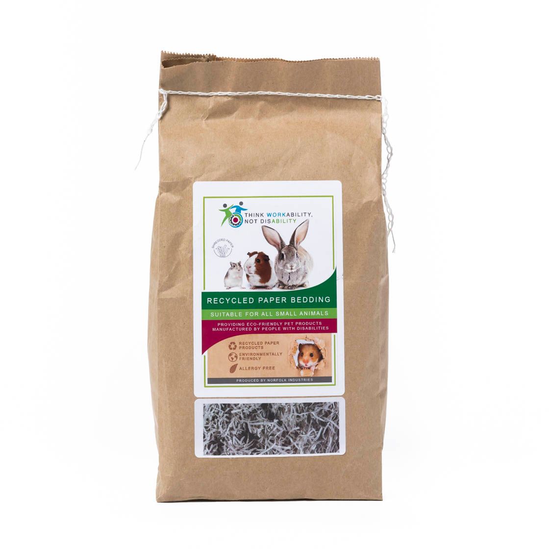 This Plastic Free - Recycled Paper Bedding from Norfolk Industries for Disabled People, is produced from 100% recycled newspaper materials that are strip shredded to provide narrow cut lengths. The bedding is biodegradable and completely digestible which makes it an alternative for pets with allergies to hay and straw bedding.