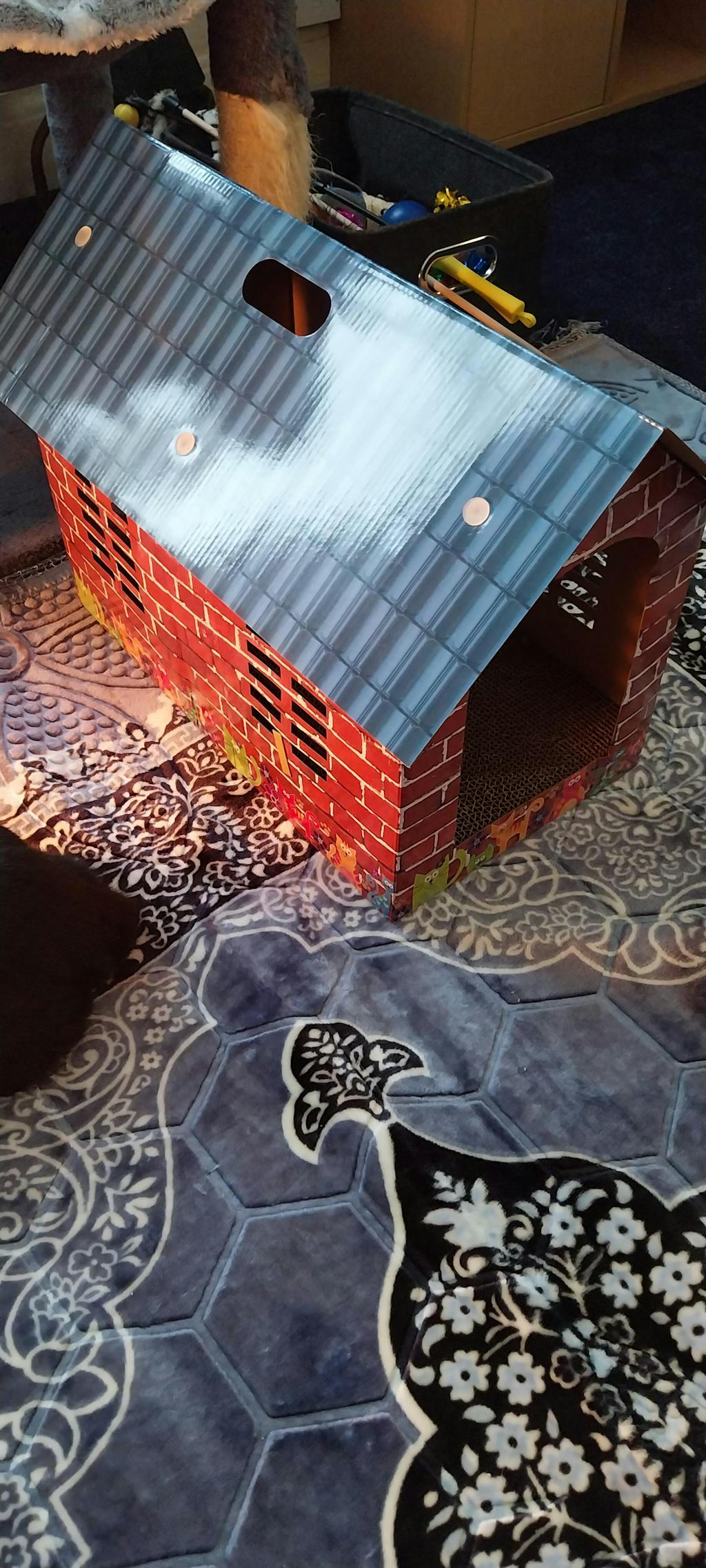 My kitten loves this product! Whether she's clawing at the floor, chewing the walls or jumping on the roof, she spends a surprising amount of time with it. It lasted us almost three months before it became so beaten up that I needed to throw it out. My only issue with this is that it comes with these little plastic pieces to attach the roof. They aren't sturdy and in the first couple of days I kept finding my kitten chewing on them. I'm not sure if they're a choking hazard, but I binned them anyway. You're better off using a strong glue or adhesive strips.