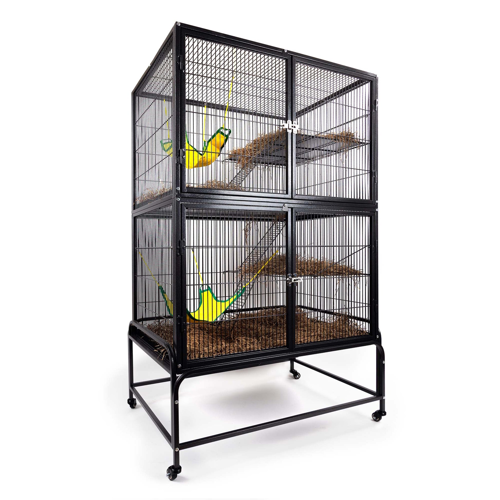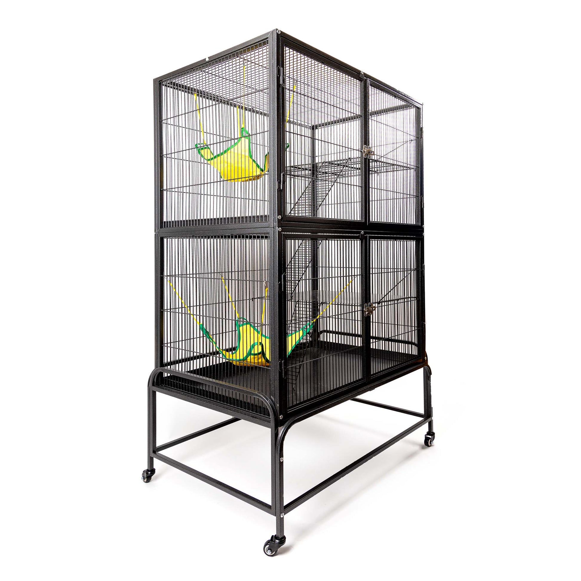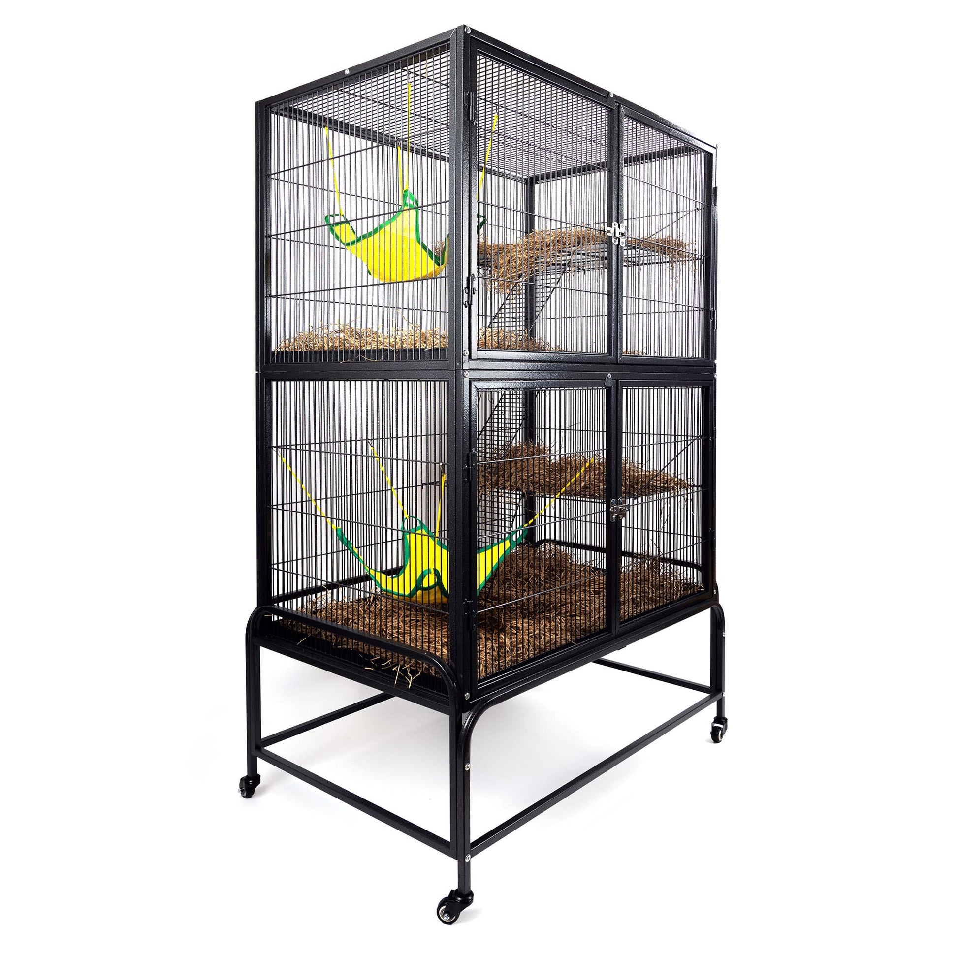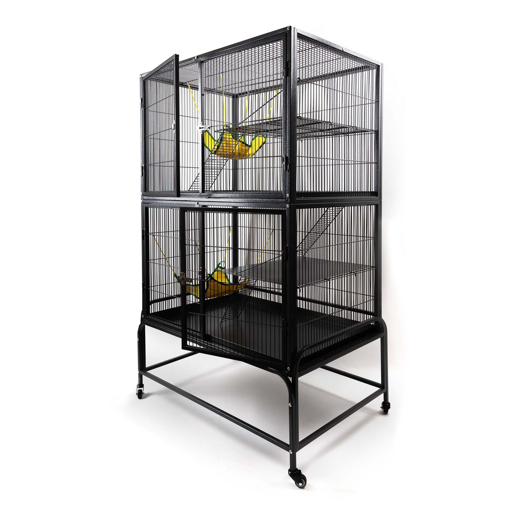 This Rat & Ferret Cage has four full width door openings for maximum accessibility for feeding and cleaning and has wide, removable, shelves and full platform pans for a spacious play area, with the protective rims on each side to prevent straw and food spillage outside the cage.