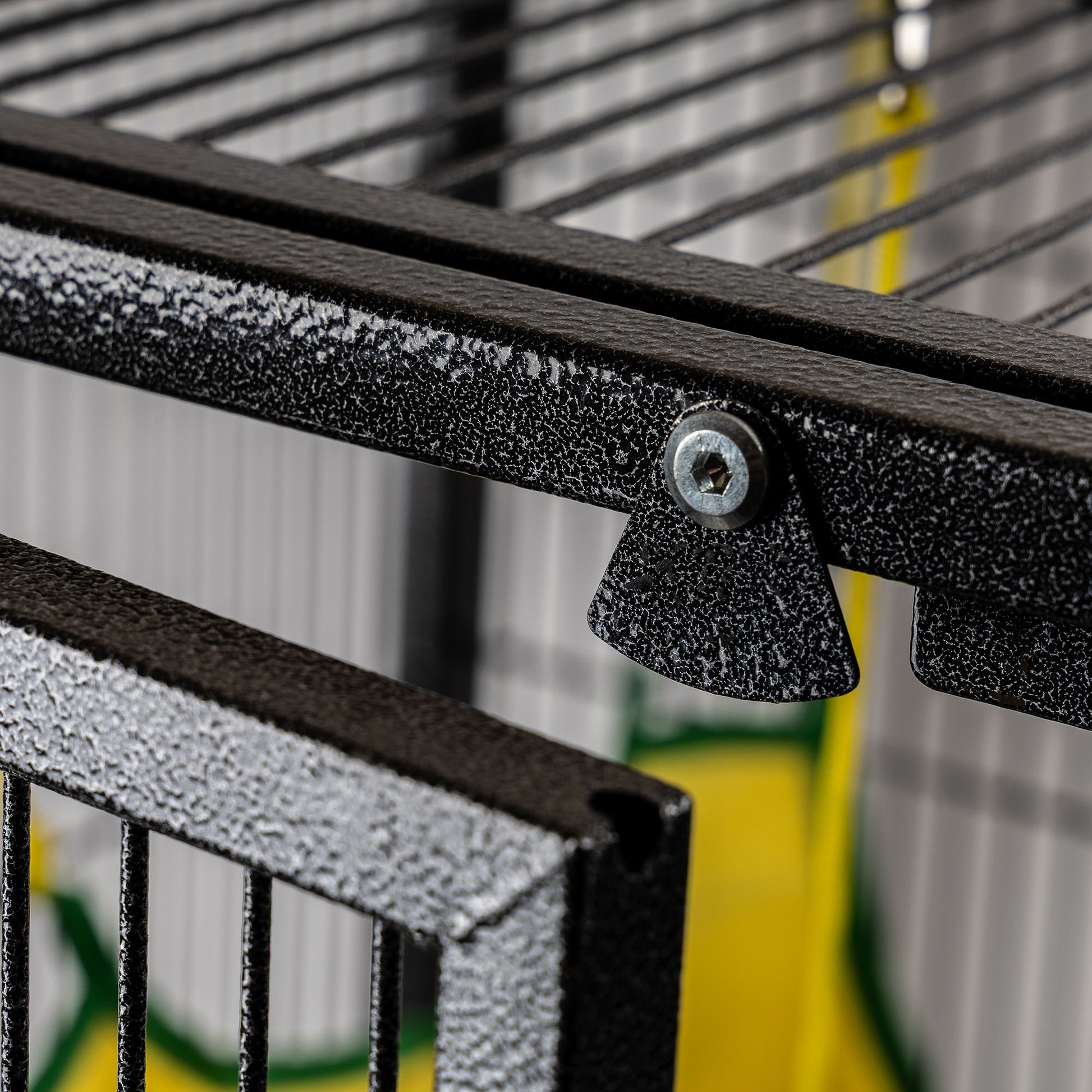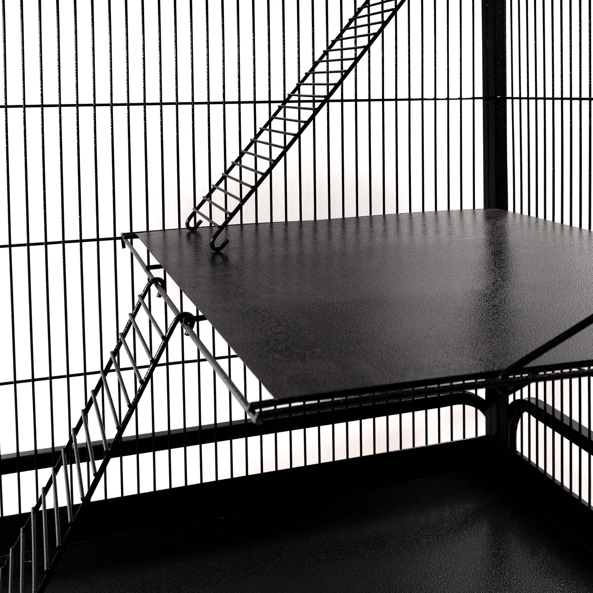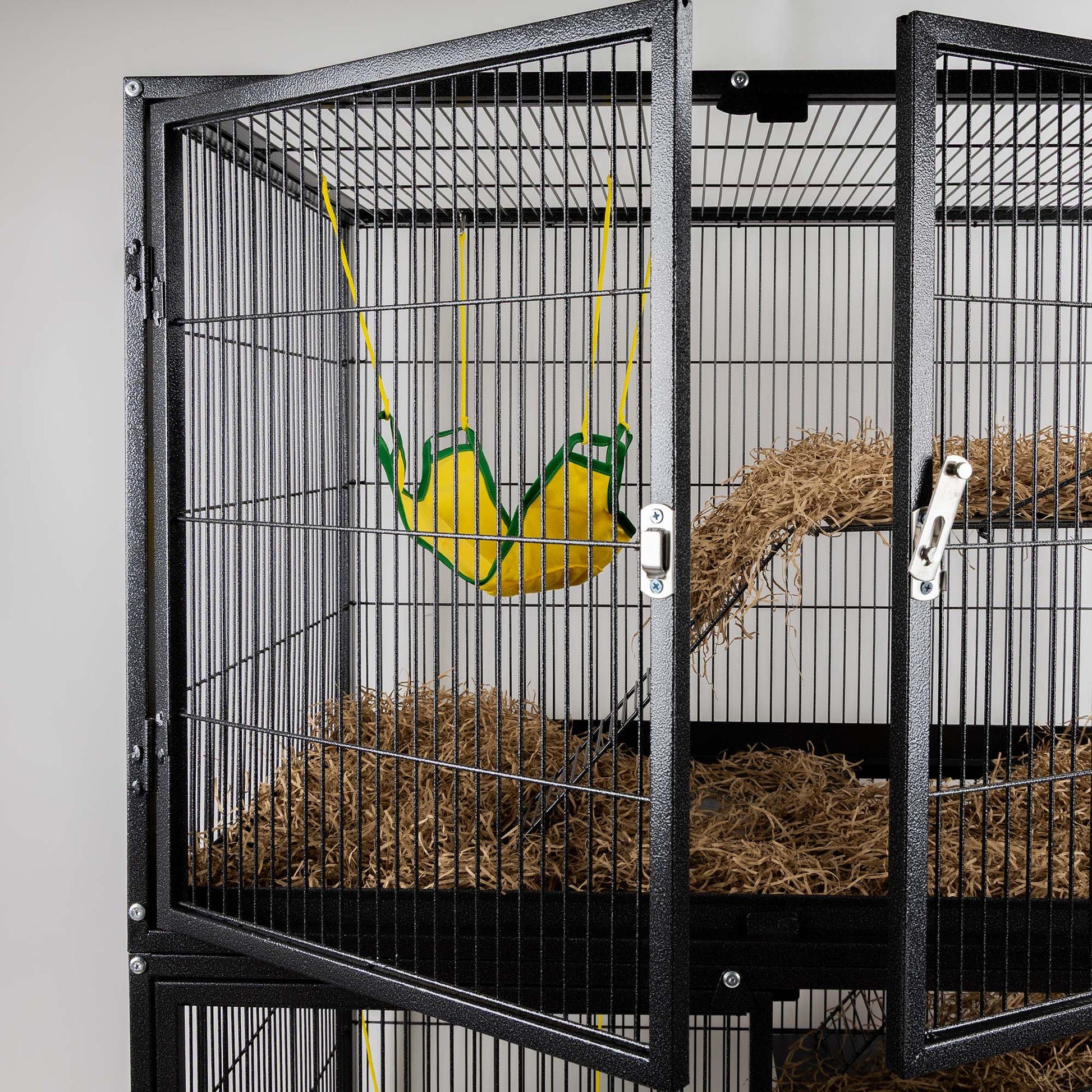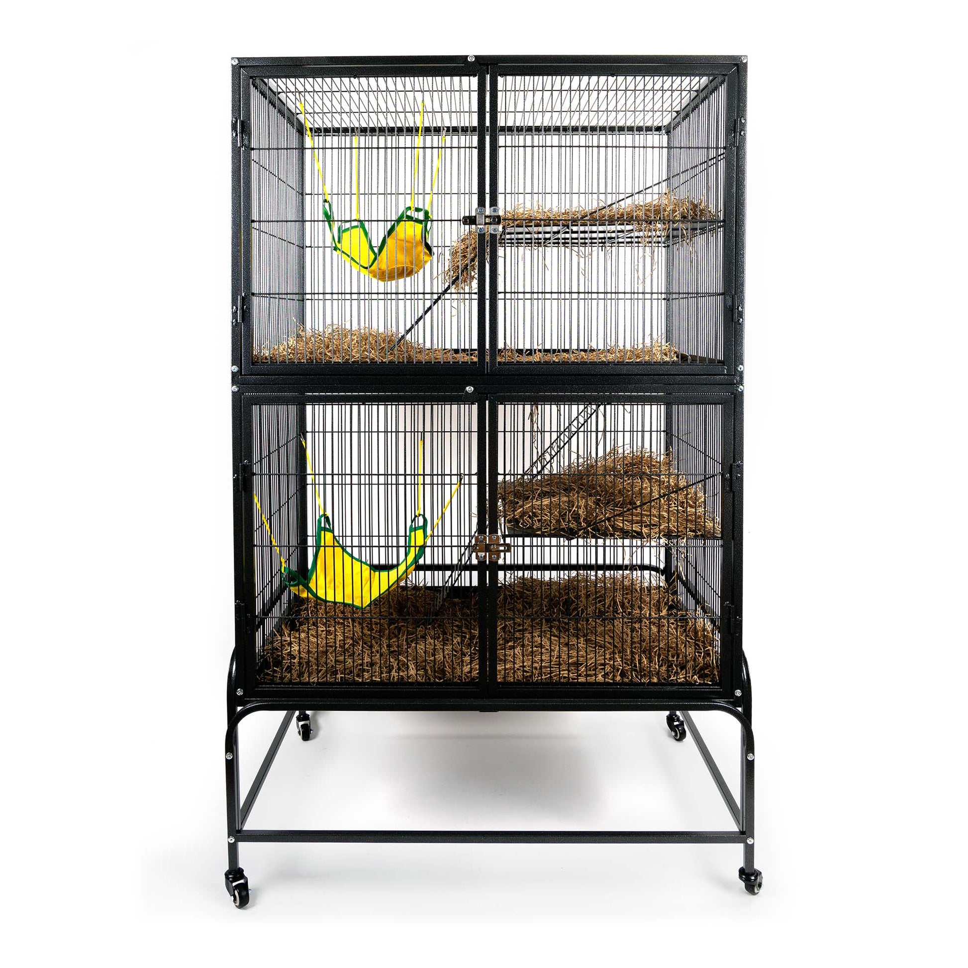 This Rat & Ferret Cage has four full width door openings for maximum accessibility for feeding and cleaning and has wide, removable, shelves and full platform pans for a spacious play area, with the protective rims on each side to prevent straw and food spillage outside the cage.