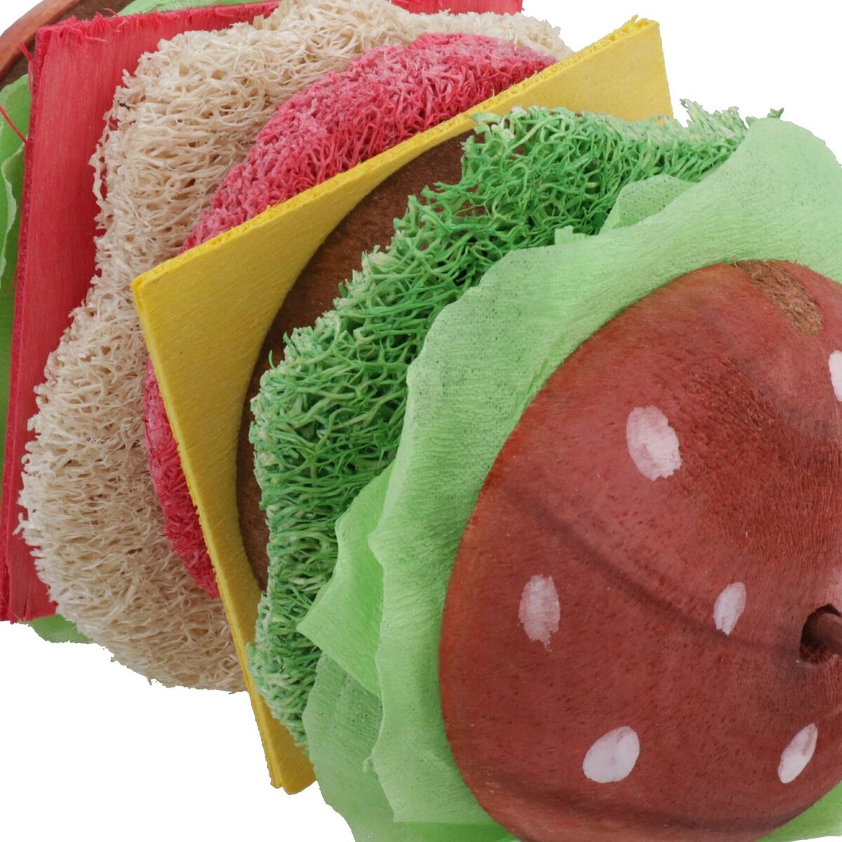 - Hanging gnaw and nibble toy made from natural loofa and wood