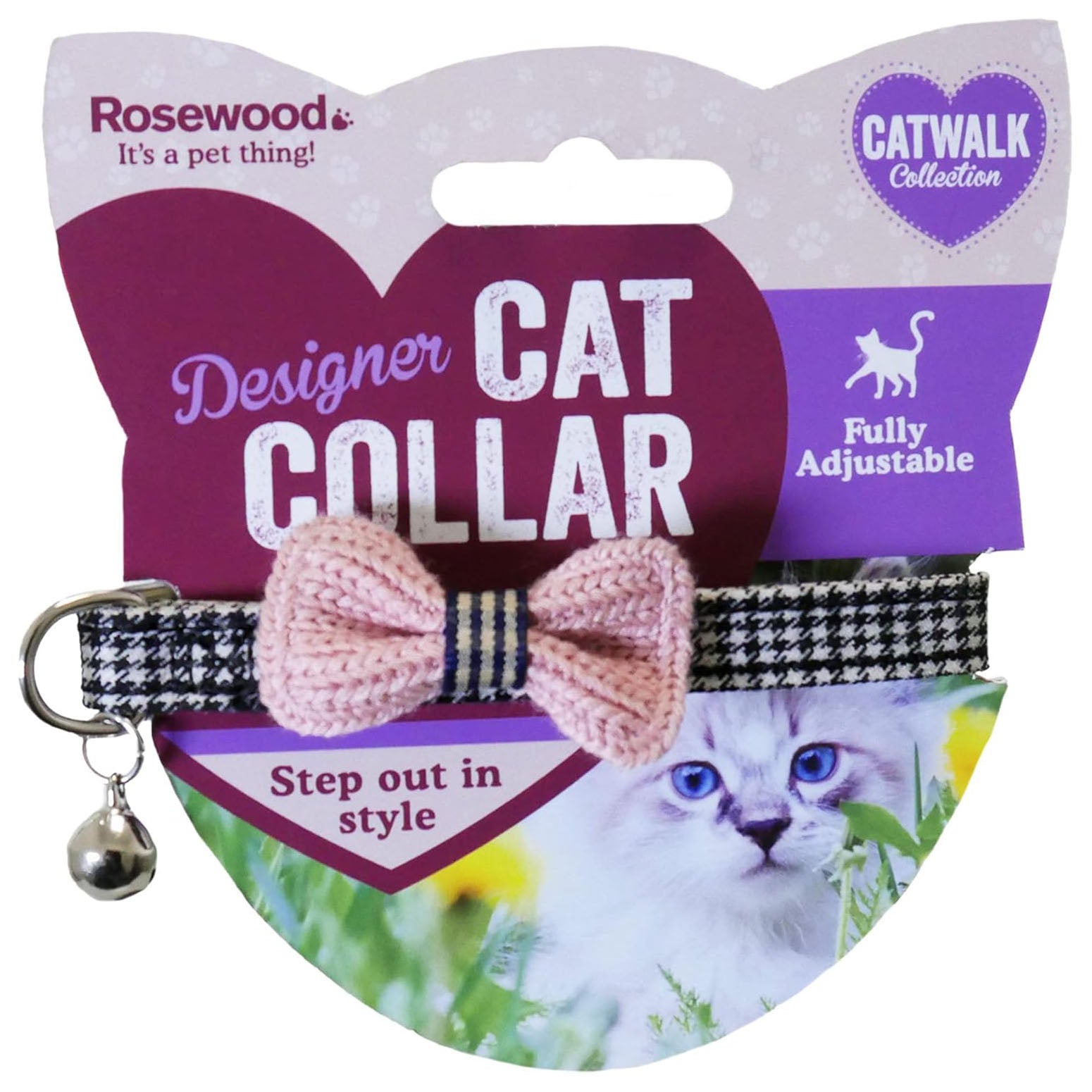 This quality, fashionable Rosewood Catwalk Collection Pink Bow Dogtooth Cat Collar features a black and white, dogtooth print with a crochet pink bow and a loud removable bell. The quick release buckle made for safety is finished with our very own Rosewood paw print logo.