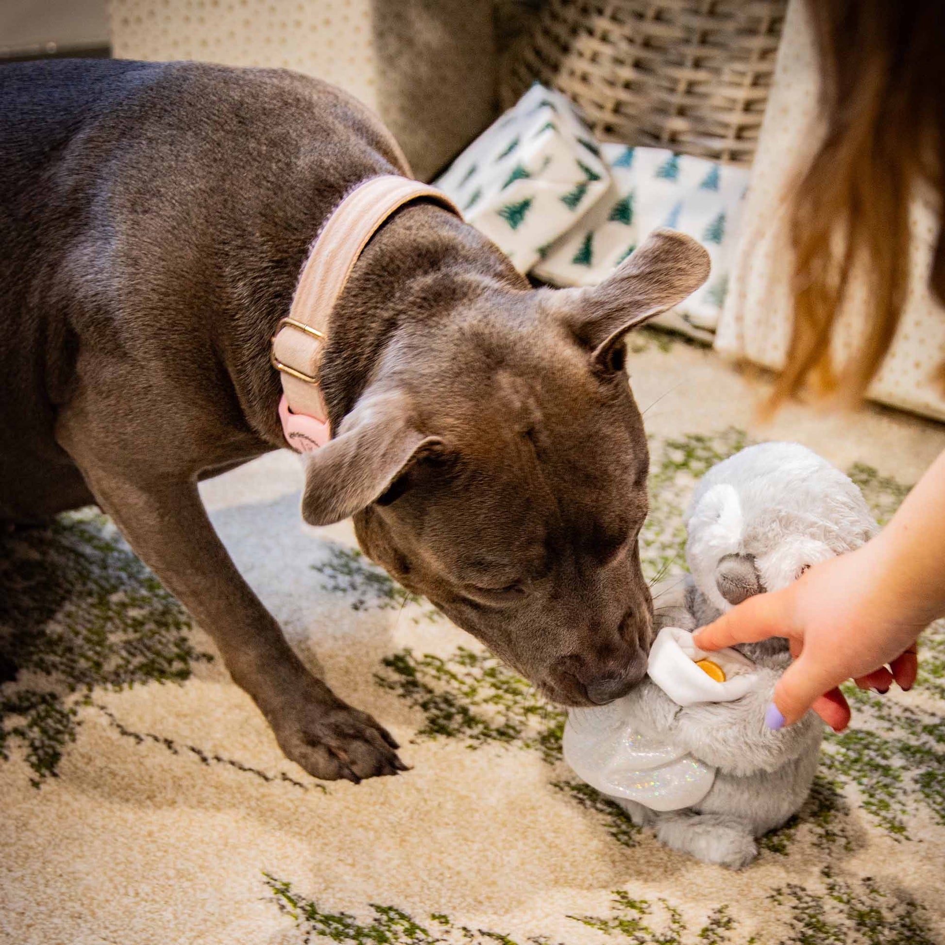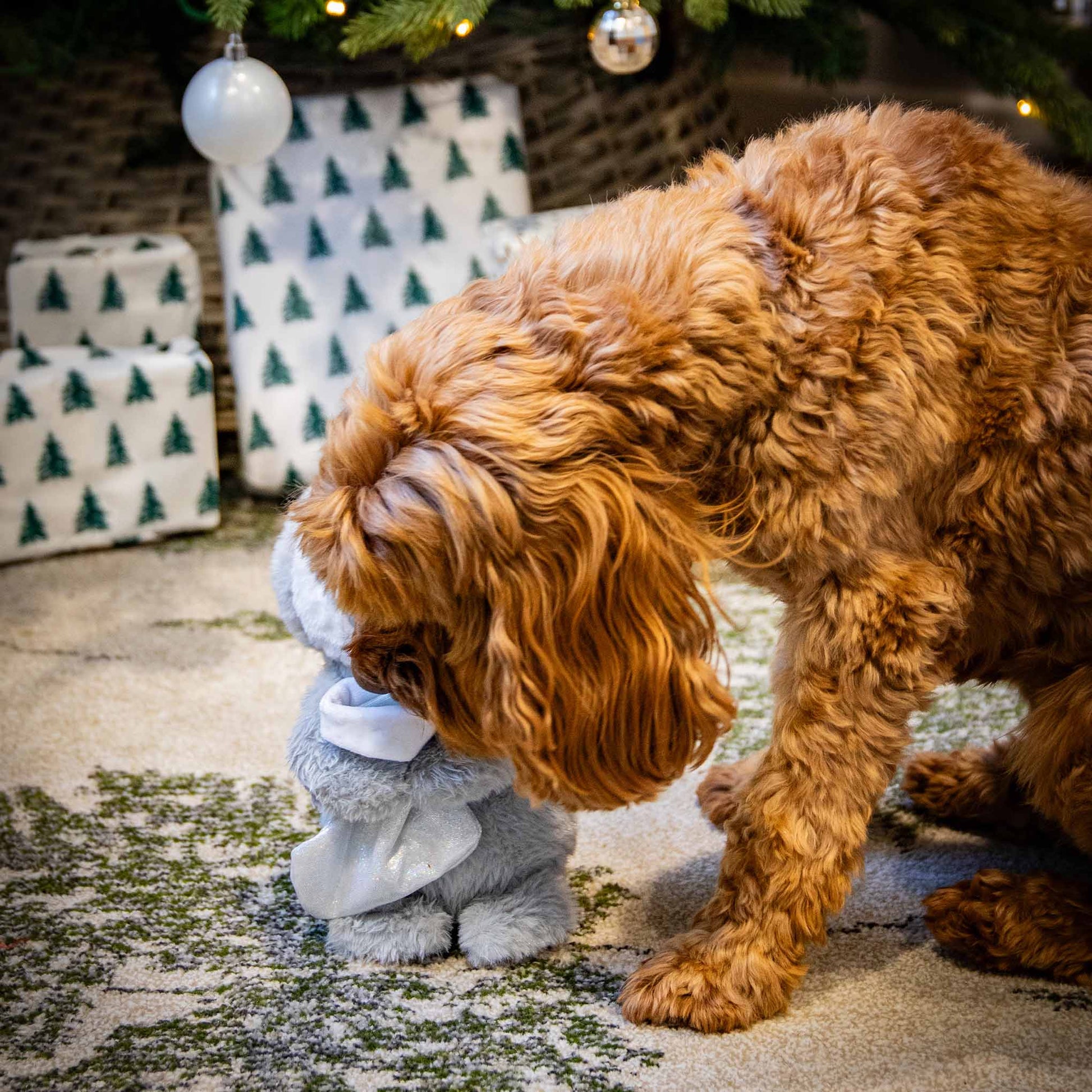 Introducing Prancer Penguin, the perfect plush dog toy for holiday cuddles and enrichment! This soft grey Rosewood Cupid & Comet Prancer Penguin Christmas Plush Dog Toy features an attached sparkly silver stocking, designed to provide mental stimulation for your pup. Simply tuck treats inside the stocking for a fun snuffle activity that keeps your dog engaged and entertained. Prancer Penguin is a festive, interactive toy that combines comfort and enrichment, making it the ideal holiday gift for your furry friend!